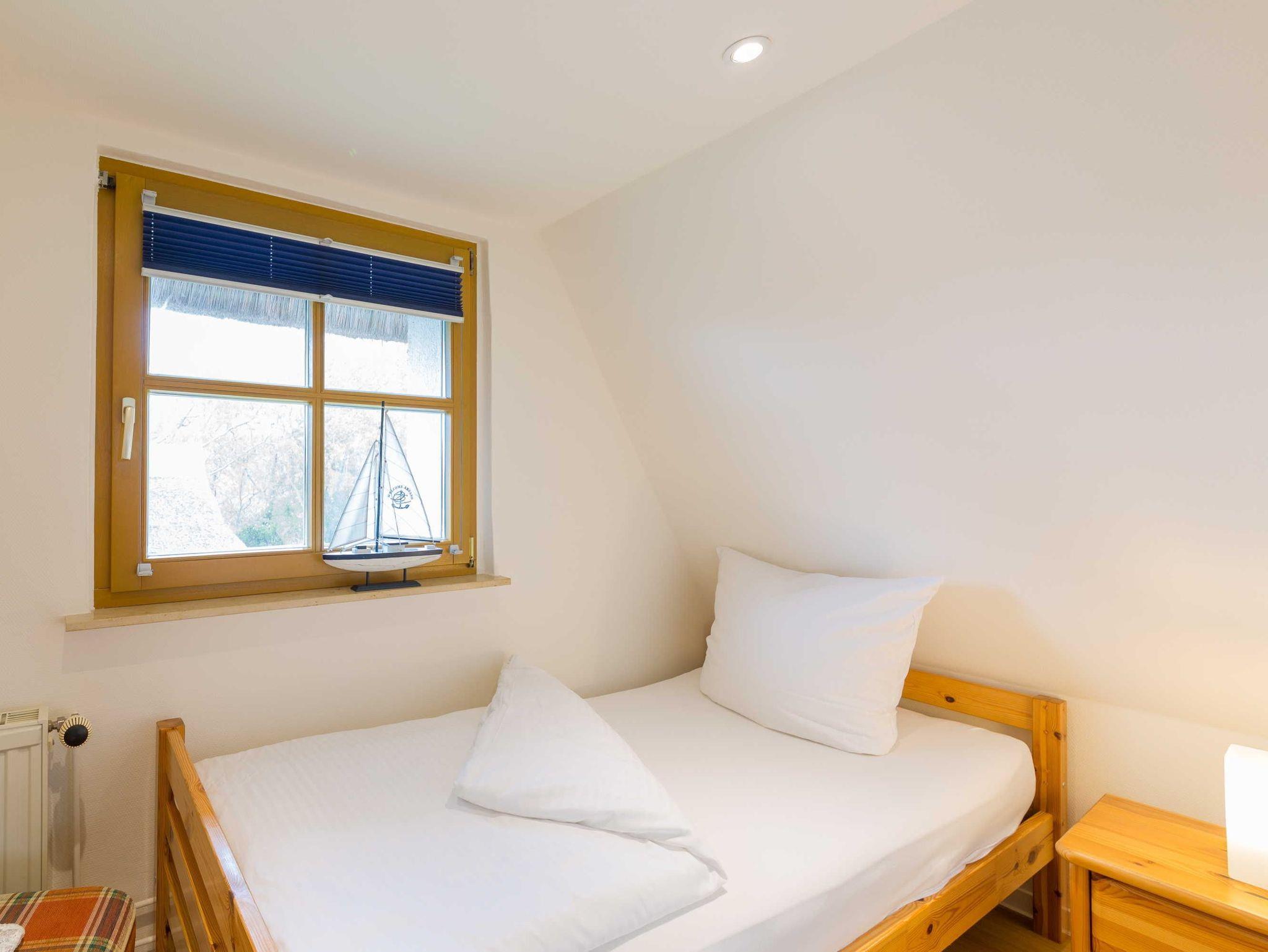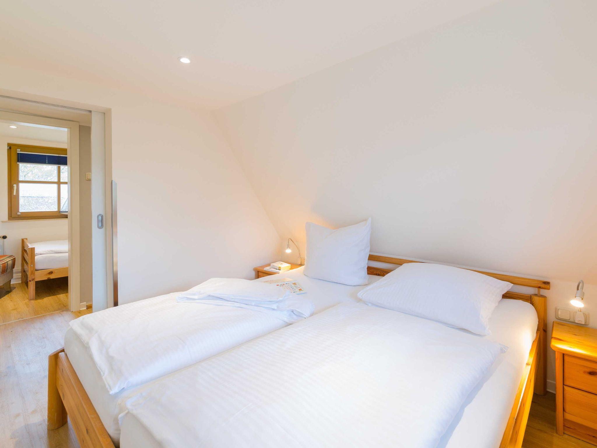 Im Dachgeschoss liegen das Schlafzimmer mit Doppelbett (180x200cm), ein Kinderzimmer mit Einzelbett und ein kleines Kinderzimmer. Das Einzelbett hat jeweils die Größe 90x200 cm.