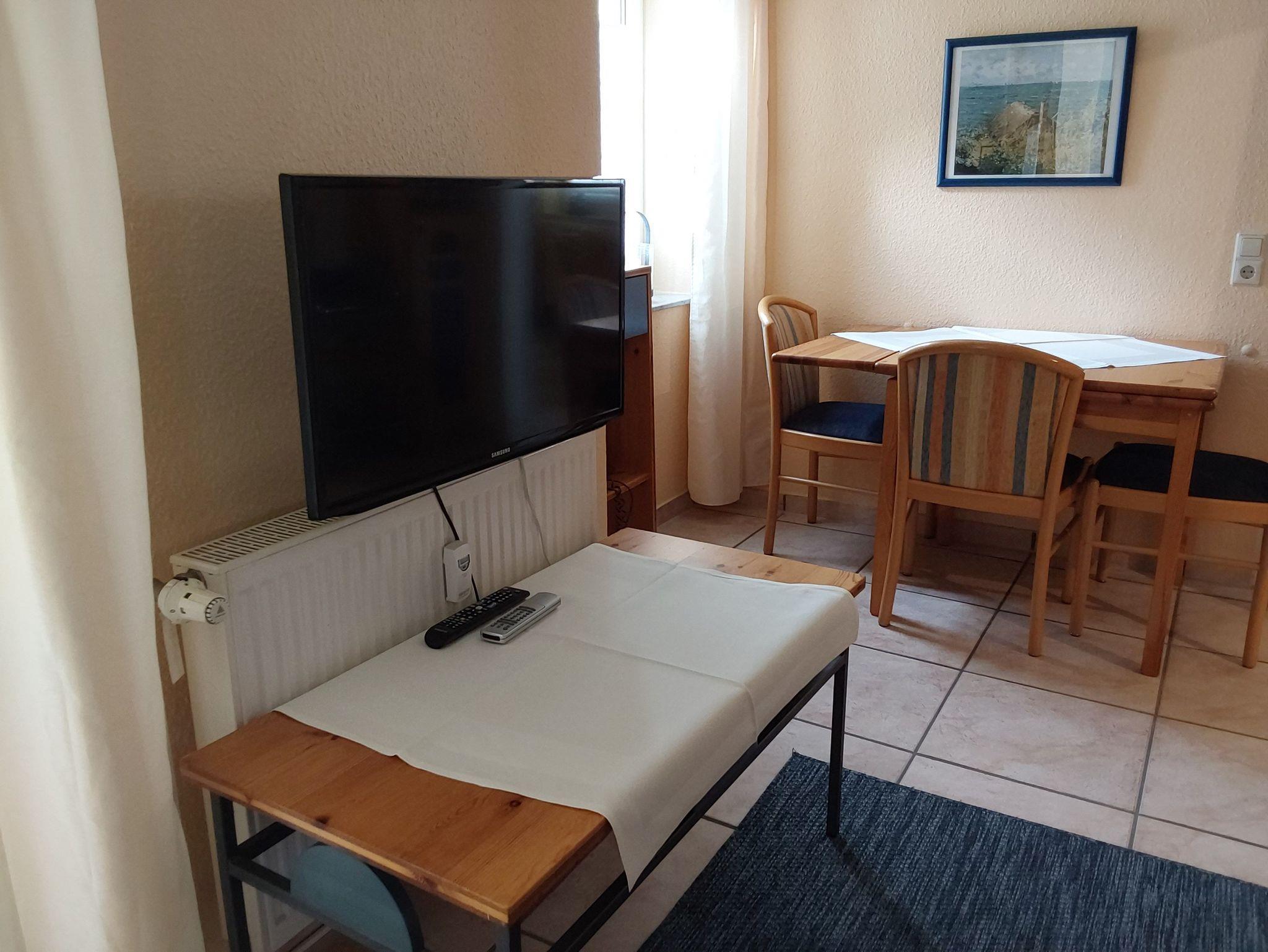 Die FEWO ist für zwei Personen üppig groß und insgesamt gut ausgestattet. Die fehlende Spülmaschine fällt bei zwei Personen kaum ins Gewicht, das fehlende W-Lan ist nicht mehr zeitgemäß. Auch die weißen Plastikstühle auf den Balkonen sollten einmal erneuert werden.