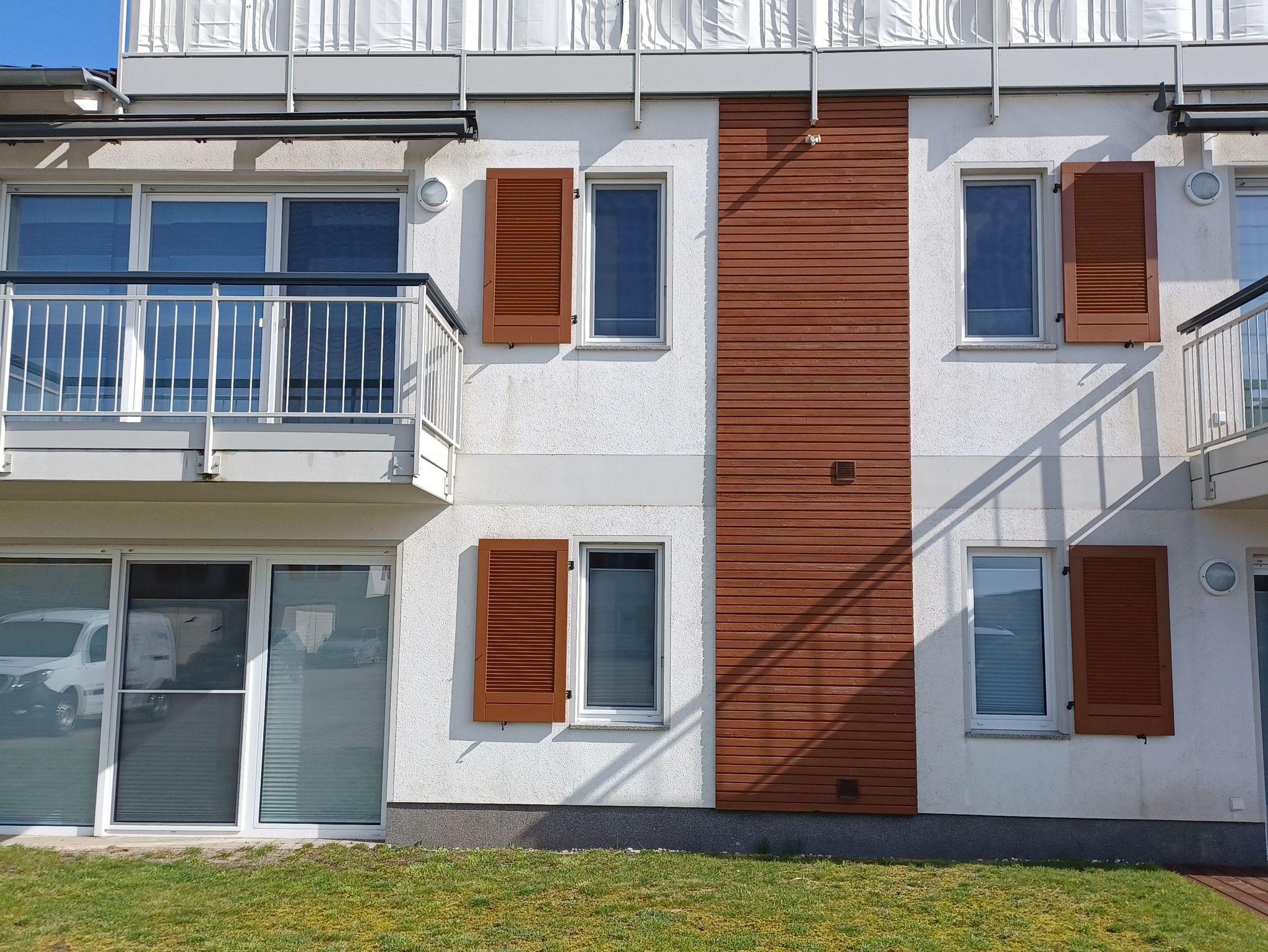 Auf den zwei Südbalkonen schützen Sie große Markisen mit Volant auf der Vorderseite; Sonnen- und Sichtschutz zugleich.