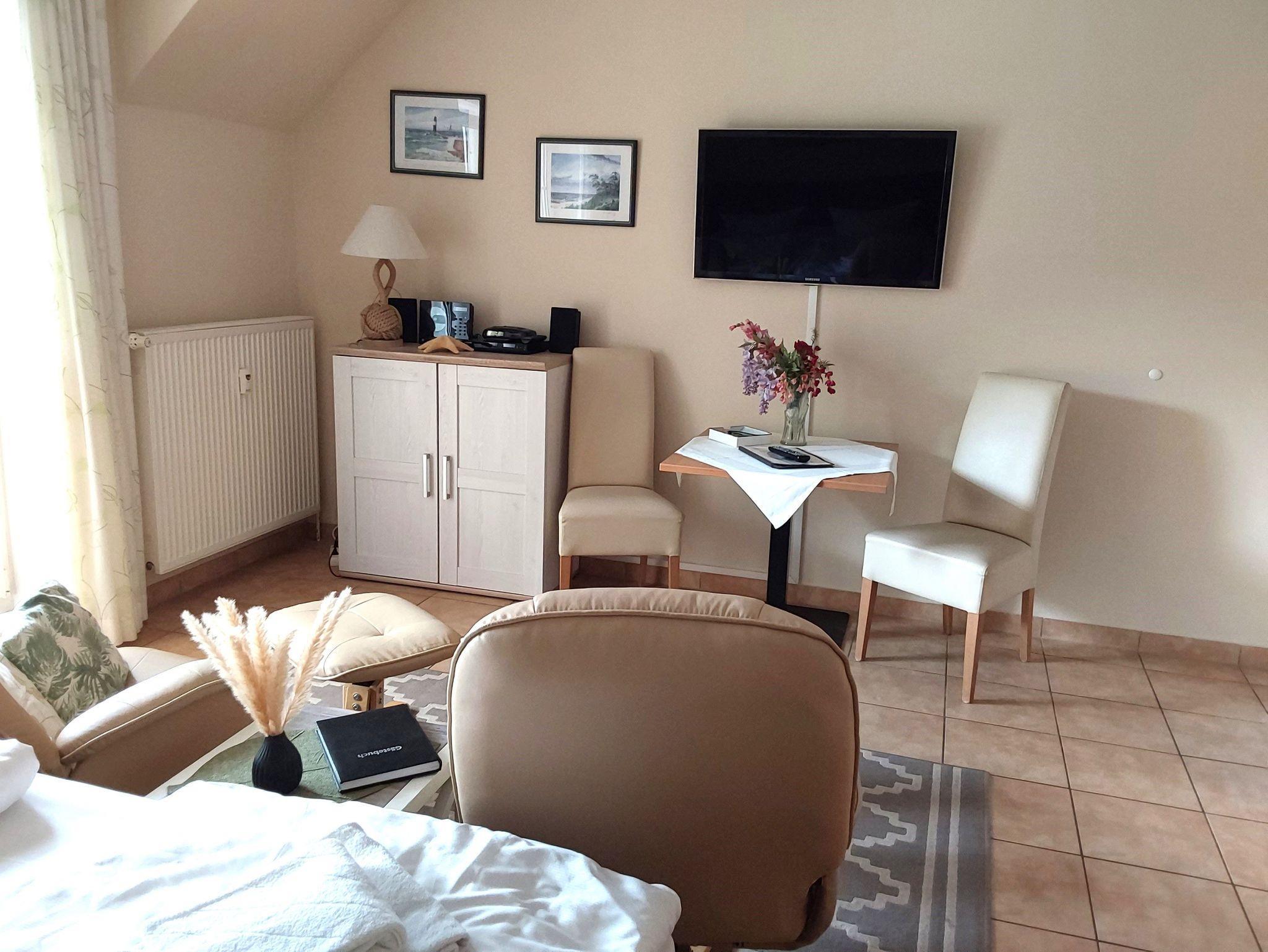 Die FEWO ist für zwei Personen üppig groß und insgesamt gut ausgestattet. Die fehlende Spülmaschine fällt bei zwei Personen kaum ins Gewicht, das fehlende W-Lan ist nicht mehr zeitgemäß. Auch die weißen Plastikstühle auf den Balkonen sollten einmal erneuert werden.