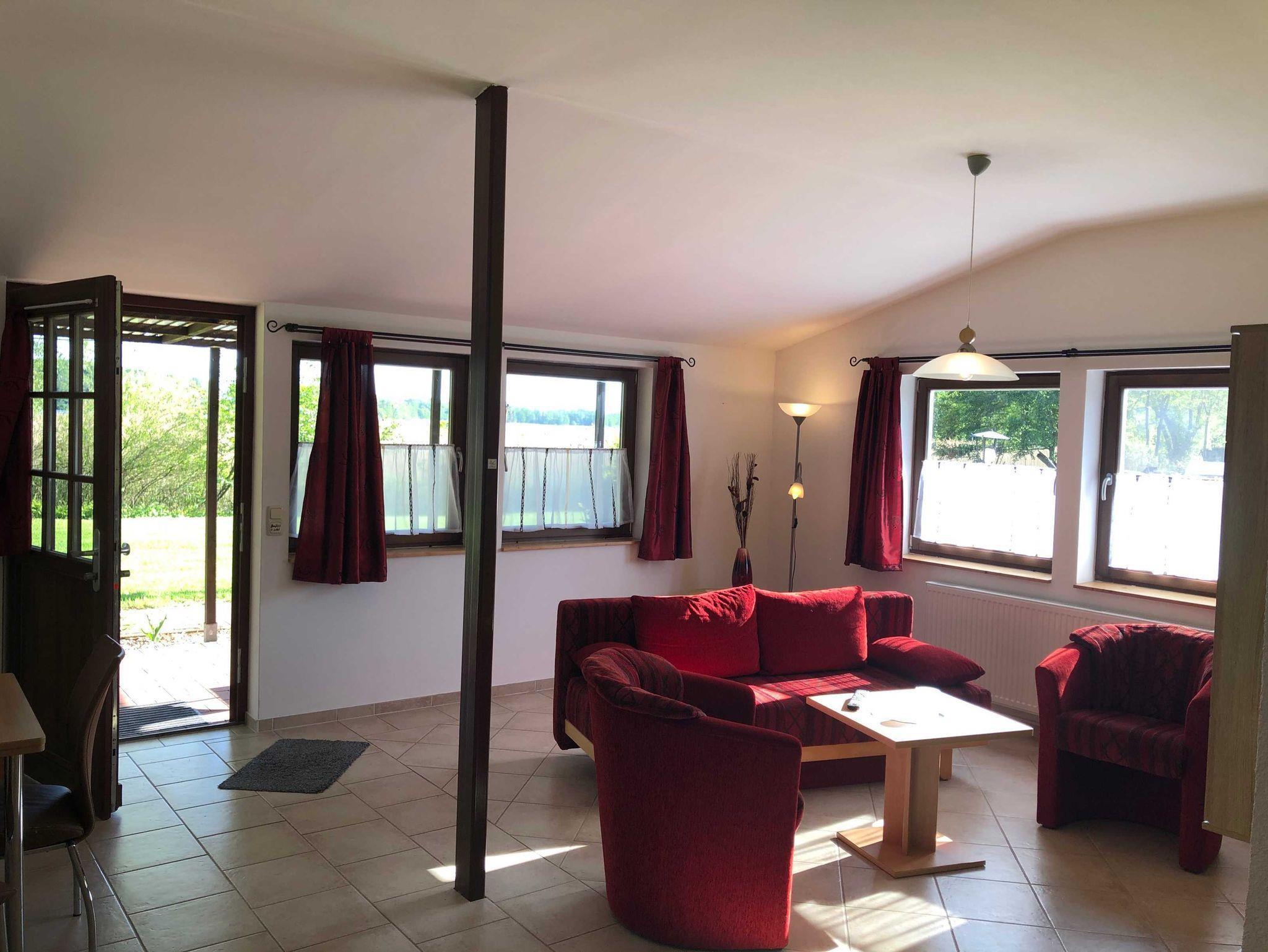 FH 1 Schlafz., großes Wohnzimmer mit Doppelbettsofa, TV, Terrasse , Küchenz. Gartenmö ,Blick auf See, Terrasse, Parkplatz