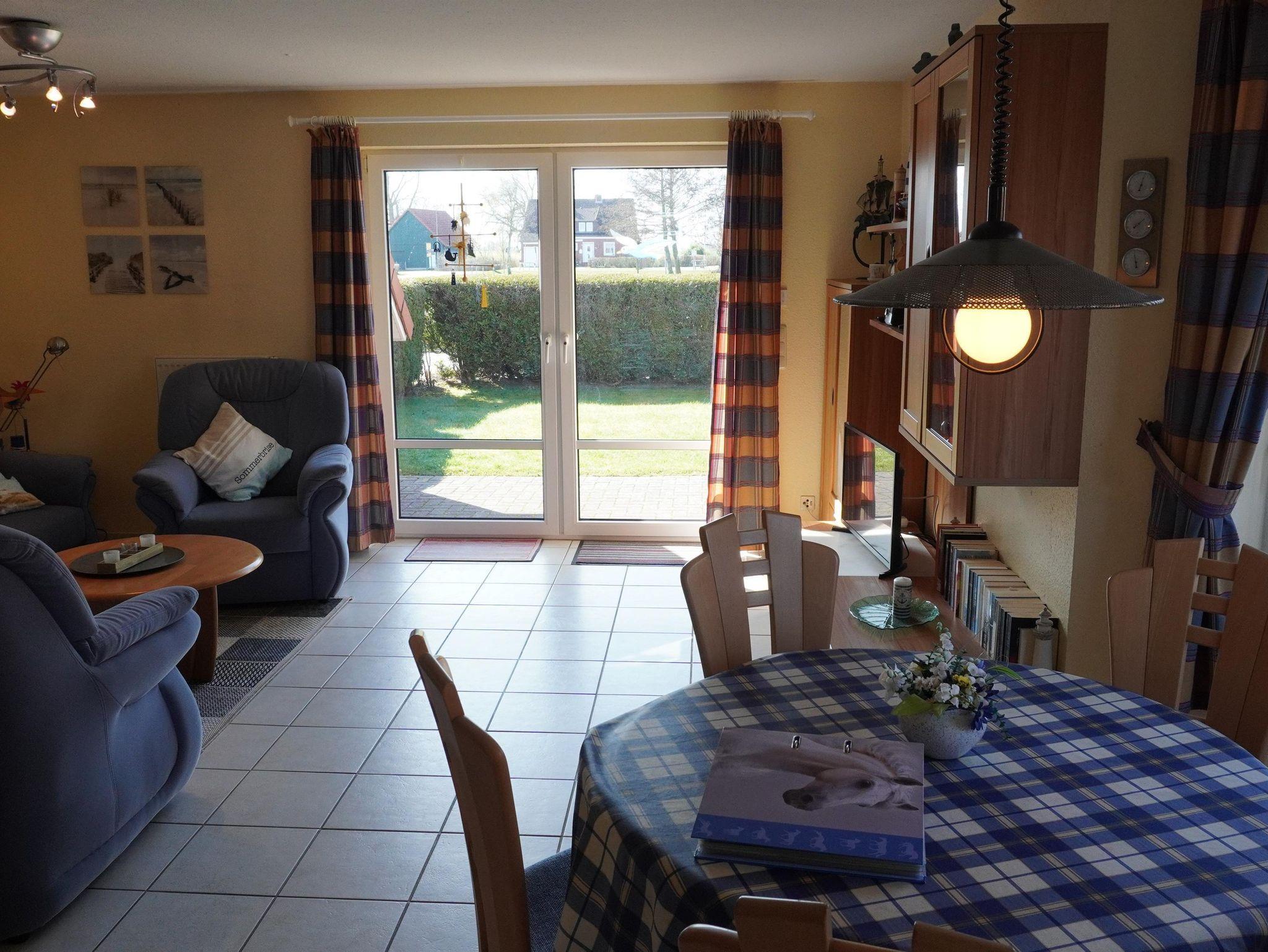 Der kombinierte Wohn- und Essbereich ist modern eingerichtet und bietet Platz für sechs Personen.