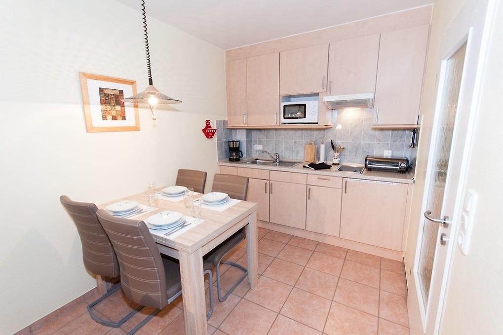 Eingangstür 90cm breit, Türen innerhalb der Wohnung 80 cm Wohnzimmer mit Essplatz und integrierter Küche. Schlafsofa. Komplett eingerichtete Küche mit Kühlschrank, 2 Plattenherd, Wasserkocher, Toaster, Kaffeemaschine und Mikrowelle.