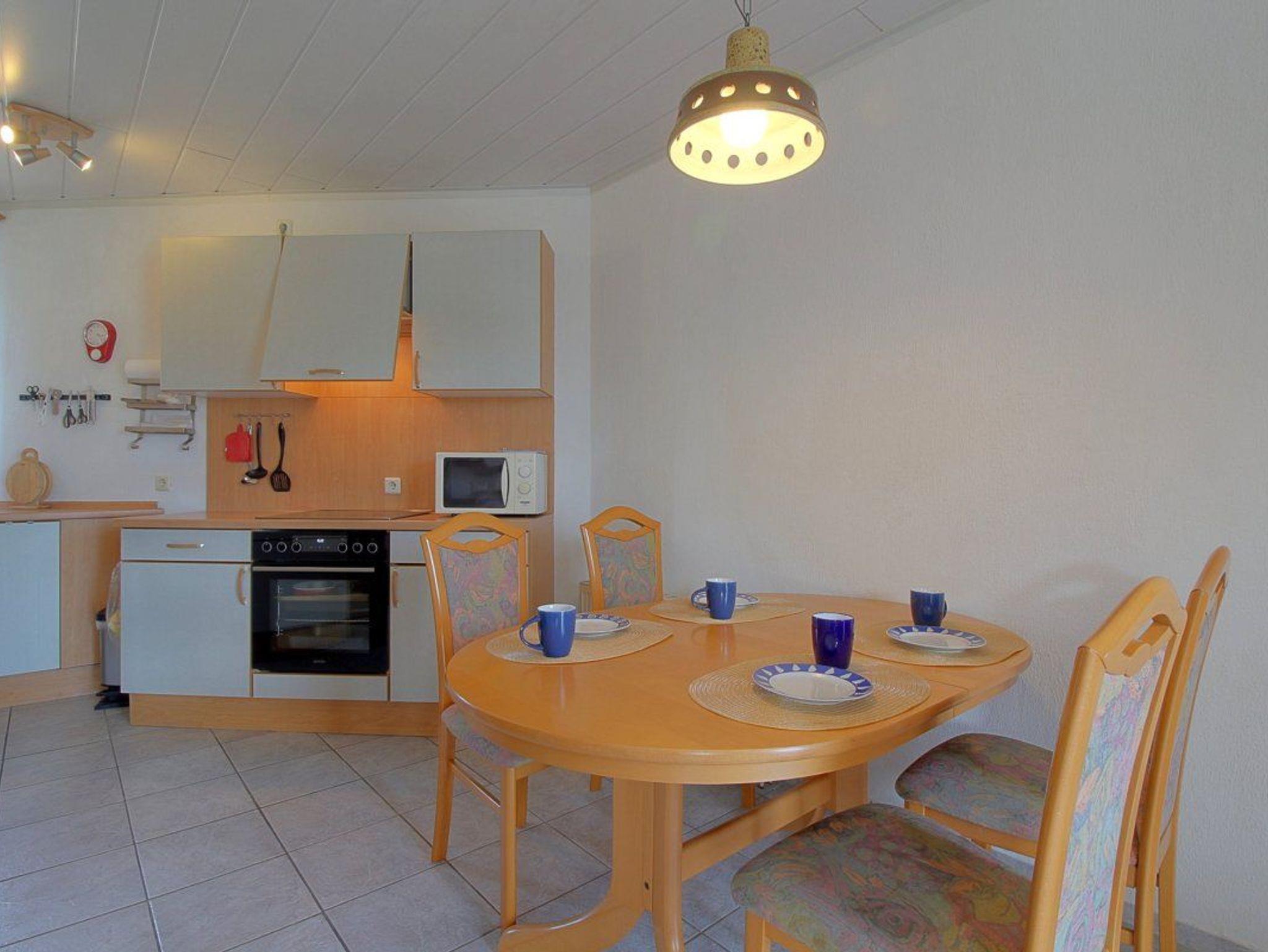 Im Erdgeschoss verfügt das Haus über einen komplett gefliesten Wohnbereich mit Flachbild-TV, Sitzecke, Essplatz für 4 Personen und Ausgang auf die Terrasse.