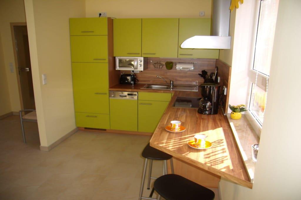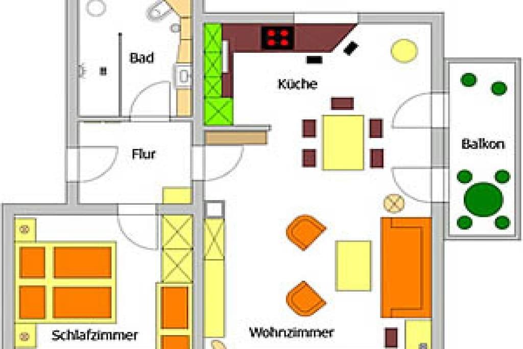 Die komfortable Nichtraucher 2 - Raum-Ferienwohnung im Hochparterre, mit ca. 55m² Wohnfläche mit 7,5m² Balkon, befindet sich in einem neu gebauten Wohnhaus. Die Ferienwohnung ist modern und freundlich eingerichtet. Im Schlafzimmer stehen ein Doppelbett und ein Juniorbett 70x160. Das Wohnzimmer verfügt über eine Schlafcouch als Übernachtung für eine weitere Personen. Im Wohnbereich befinden sich weiterhin ein großer LCD-Fernseher mit Kabelanschluss, DVD-Player, Radio, Wohnflachstrecke und Schreibtisch. Der Internetzugang ist über das hausinterne W-LAN möglich. Die moderne Kücheneckvariante ist offen im Wohnbereich integriert und mit allen notwendigen Geräten ausgerüstet..