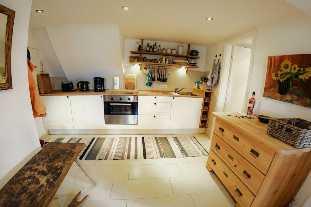 In der 1. Etage: (Wohnzimmer(, , , , Bibliothek, TV, Esstisch, DVD-Spieler, DVD-Spieler, Radio, Stereoanlage, Fliegenfenster), Küche(, , , Kochnische, Esstisch, Herd, Kochplatte, Wasserkocher, Toaster, Kochherd, Kaffeemaschine, Backofen, Kühlschrank, Tiefkühlschrank), Schlafzimmer(, , Doppelbett), Badezimmer(, , Toilette, Badewanne, Dusche, Waschbecken, Föhn)) , , , Internet, Erste-Hilfe-Station, Balkon(, Gartenmöbel), Heizung, Parkplatz, Bügelbrett, Bügeleisen, Trockenschrank