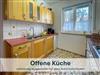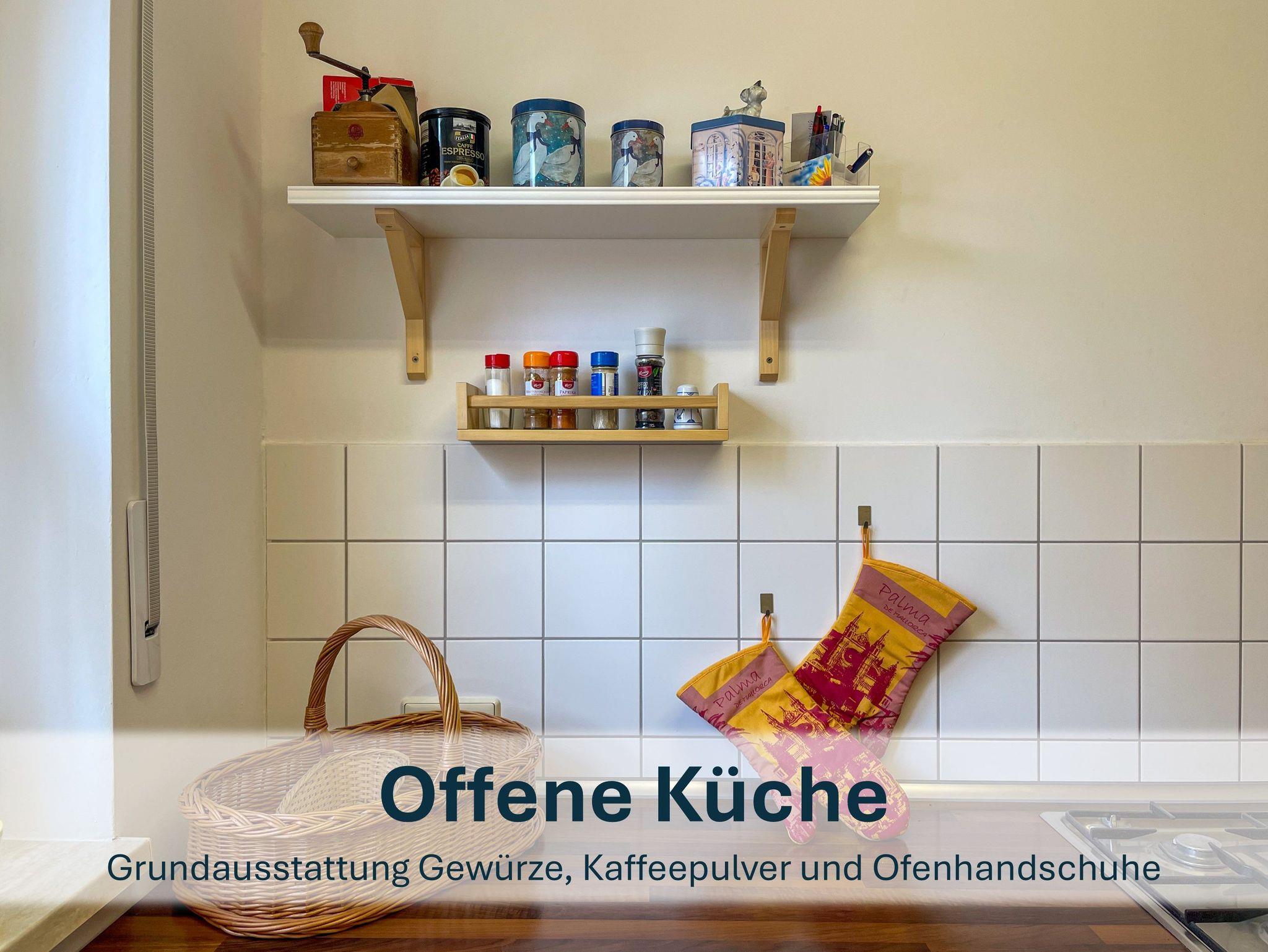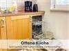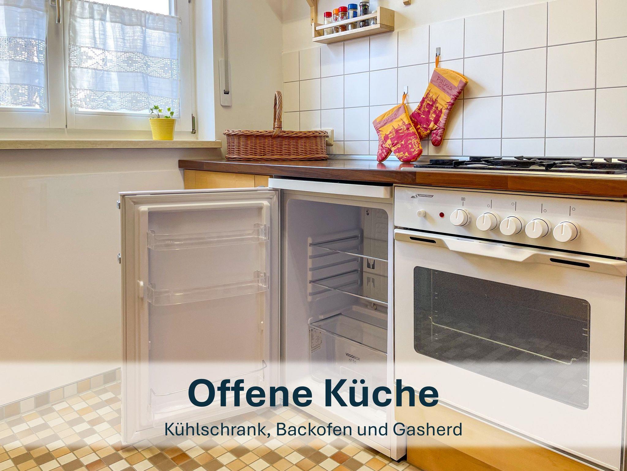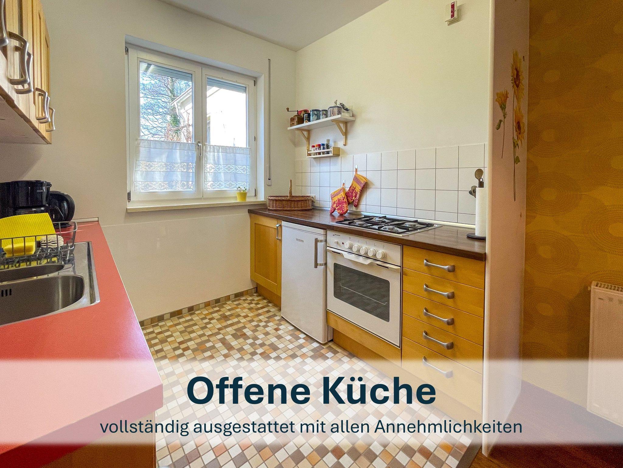 Im Eingangsbereich befindet sich linkerhand das moderne Badezimmer mit Dusche, WC, Waschbecken und Fußbodenheizung. Geradezu kommen Sie in den großzügigen Wohnbereich, wo sich die vollständig ausgestattete Küche und der Esstisch befinden.