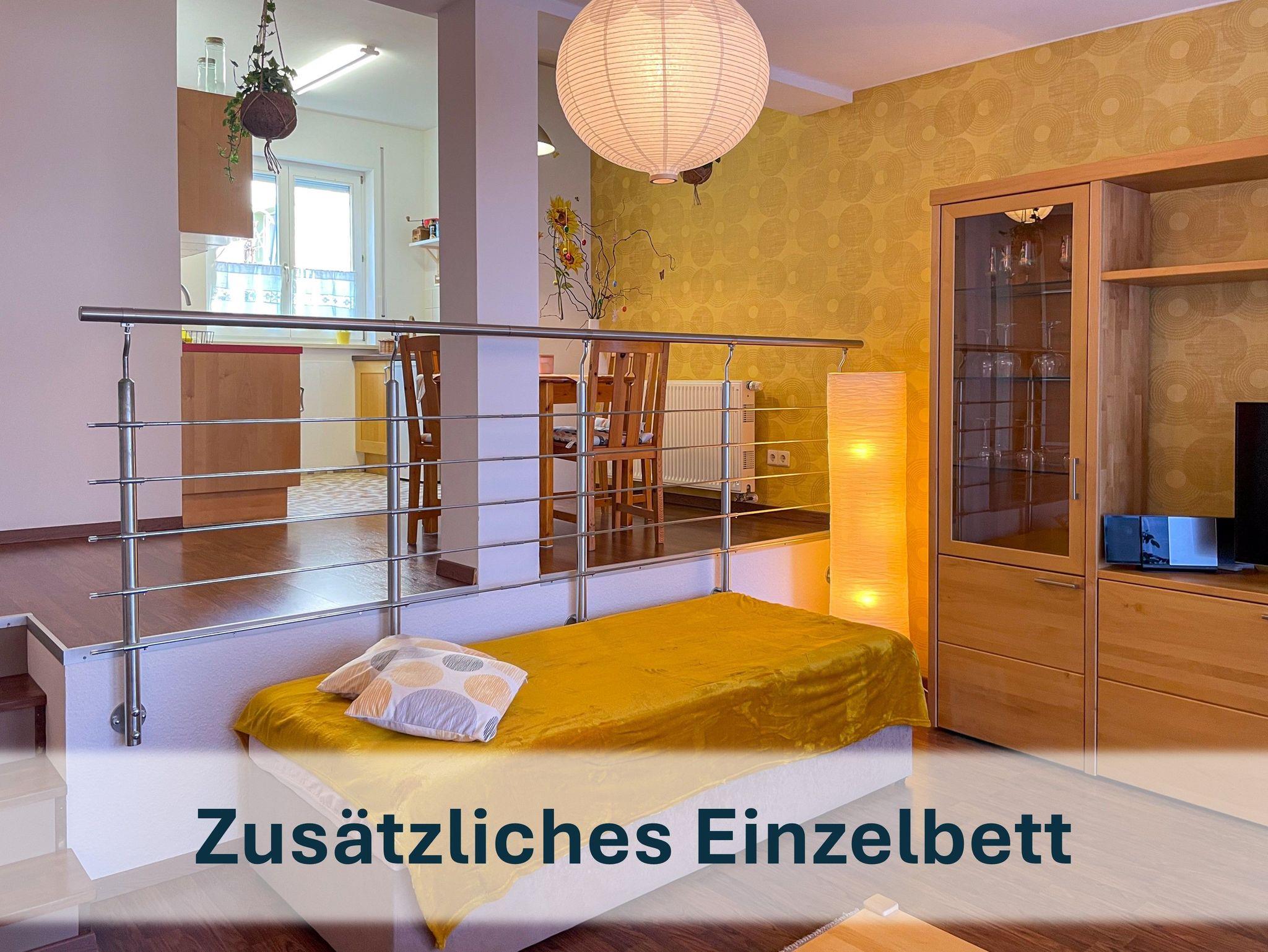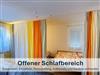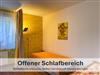 Über drei kleine Stufen kommen Sie zum Schlafbereich mit einem Doppel- und einem Einzelbett, welcher durch einen textilen Raumteiler vom Wohnbereich getrennt wird.