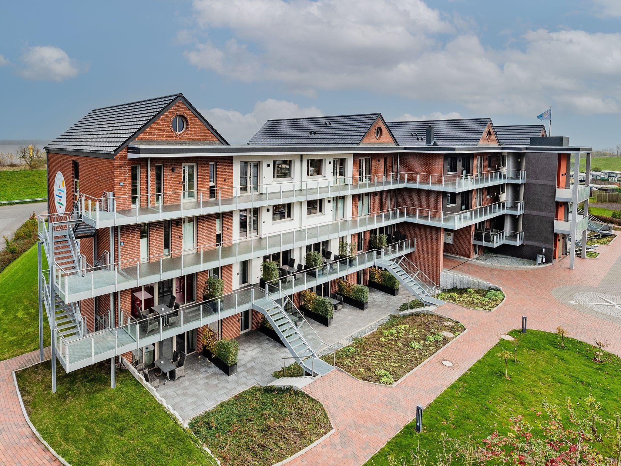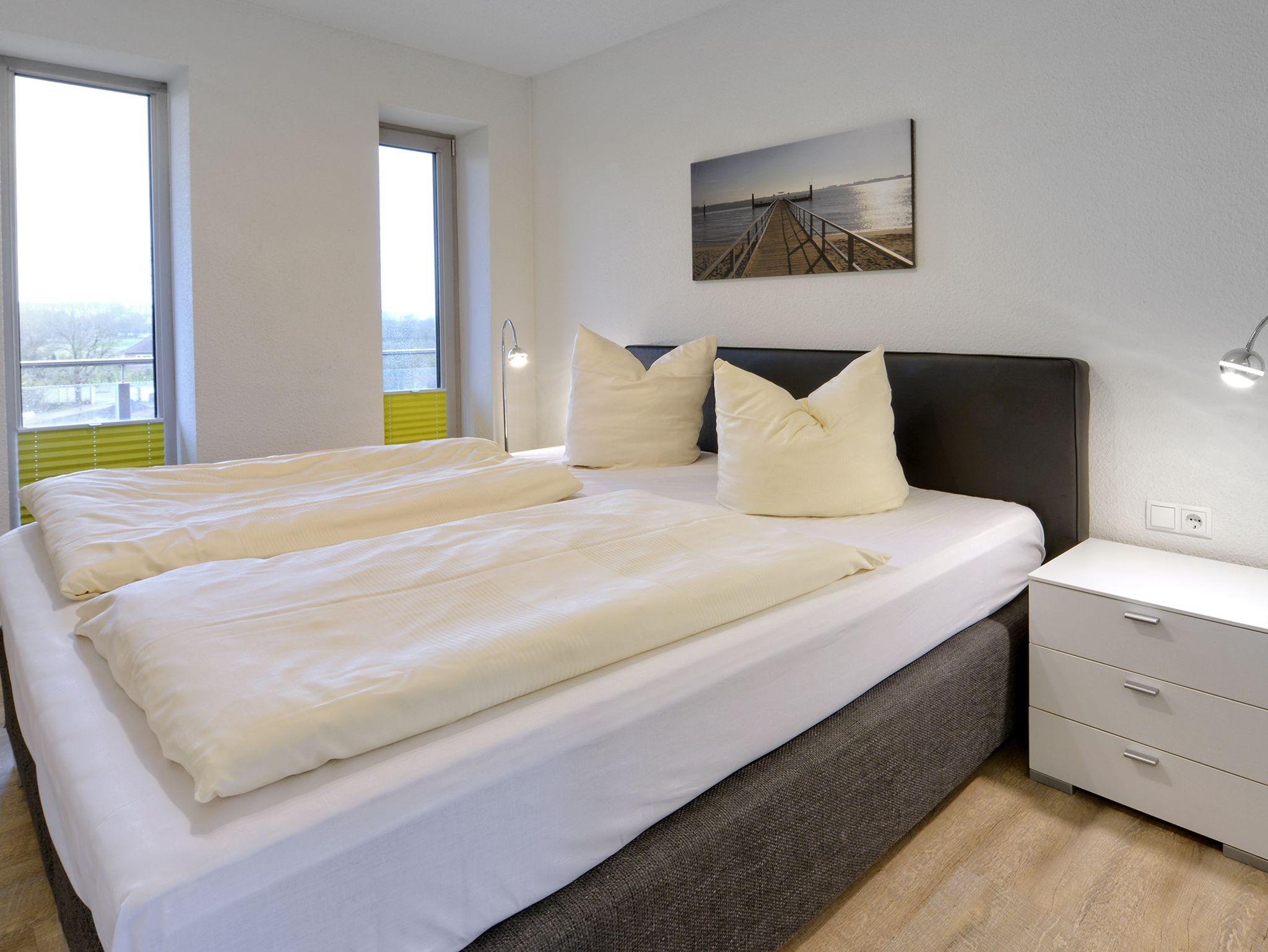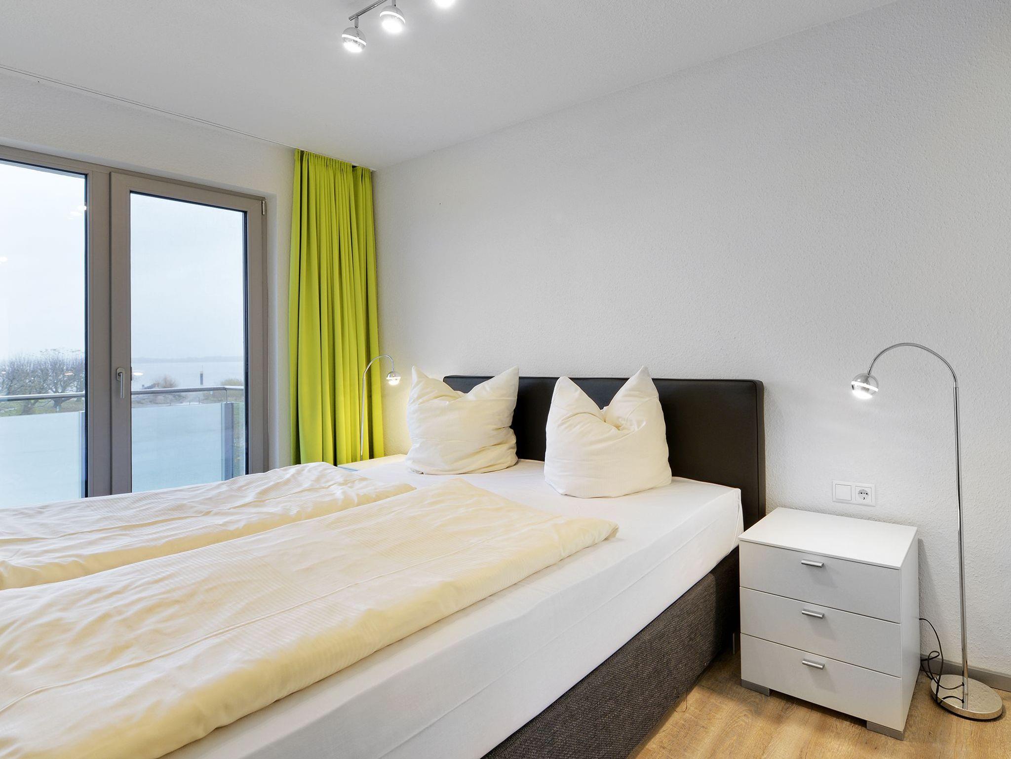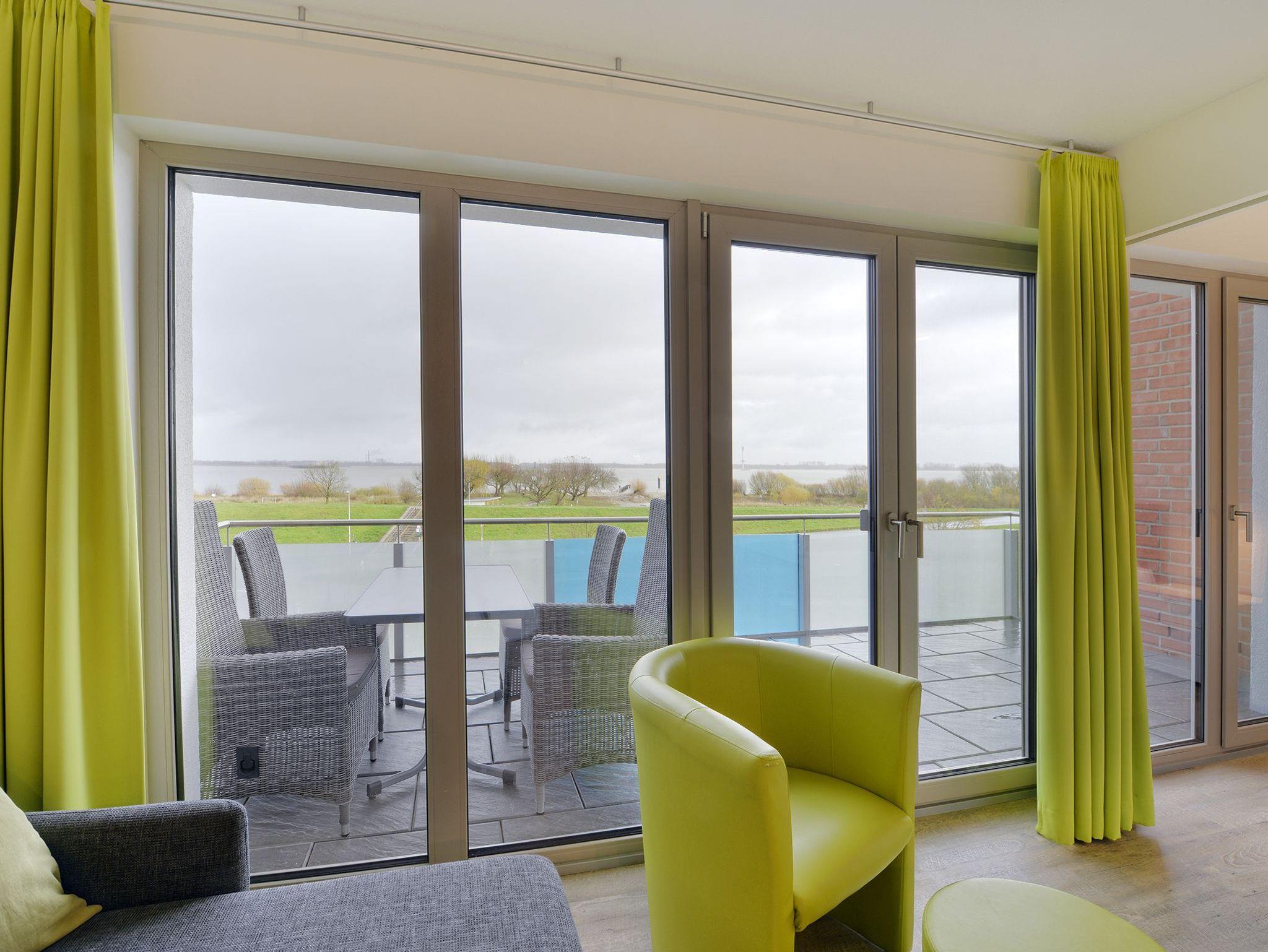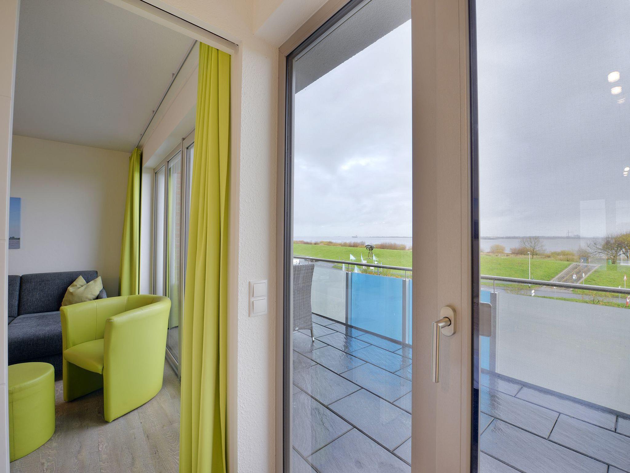 Die Appartements der Kategorie D3 R3 im Haus Lee verfügen über zwei separate Schlafzimmer, Wohn-, Koch- und Essbereich sowie einem Balkon mit direktem Blick auf die Elbe.