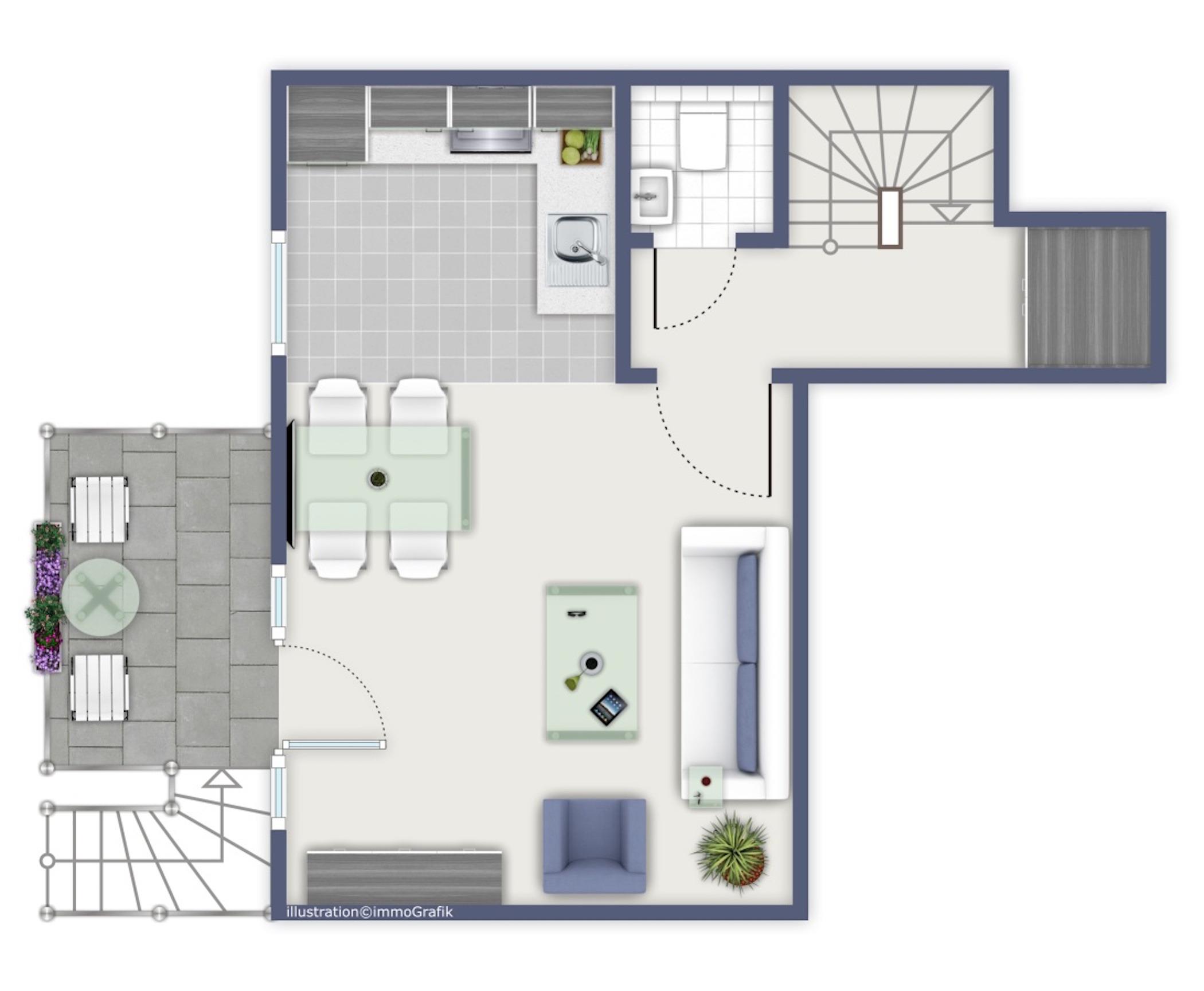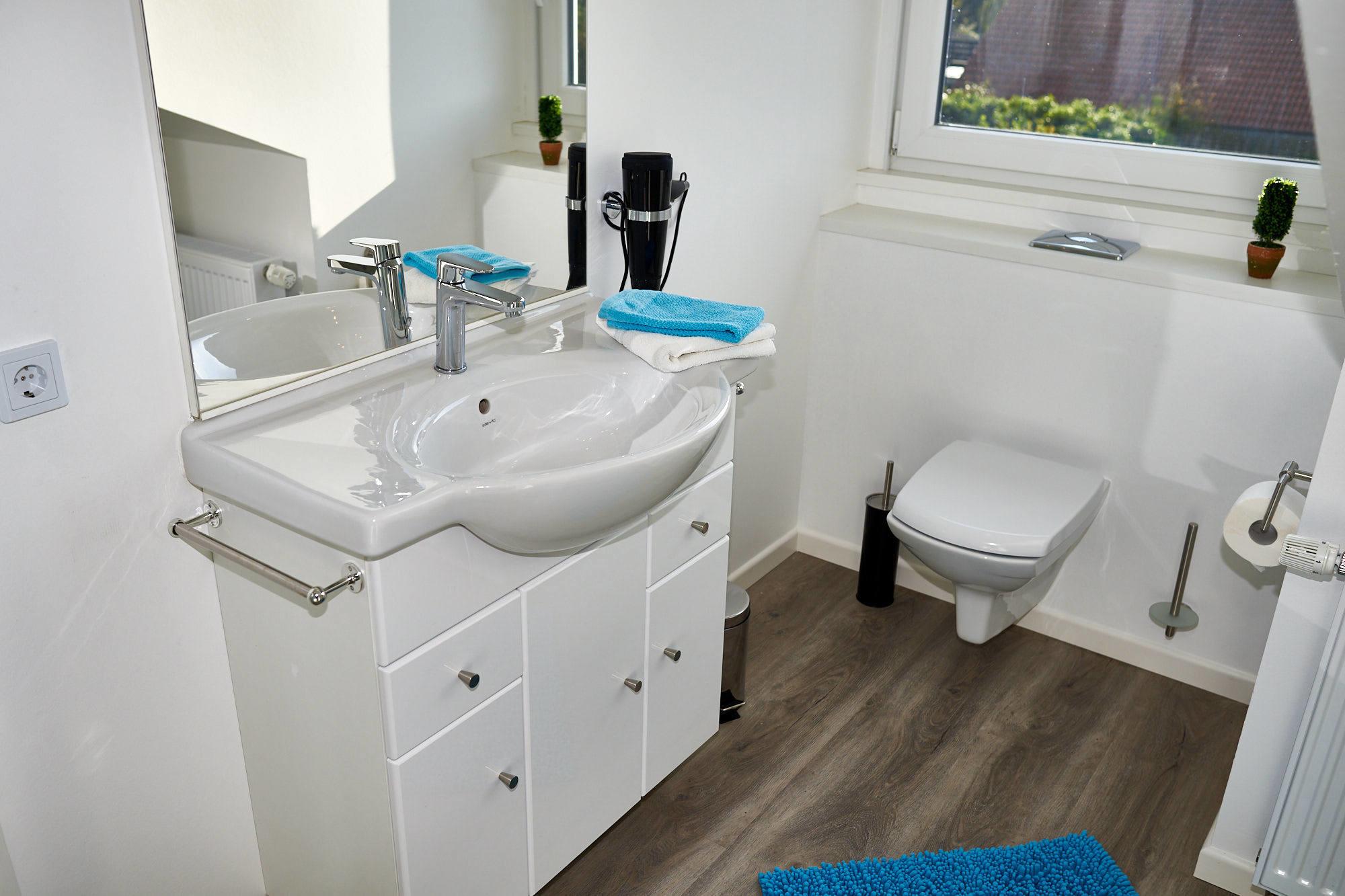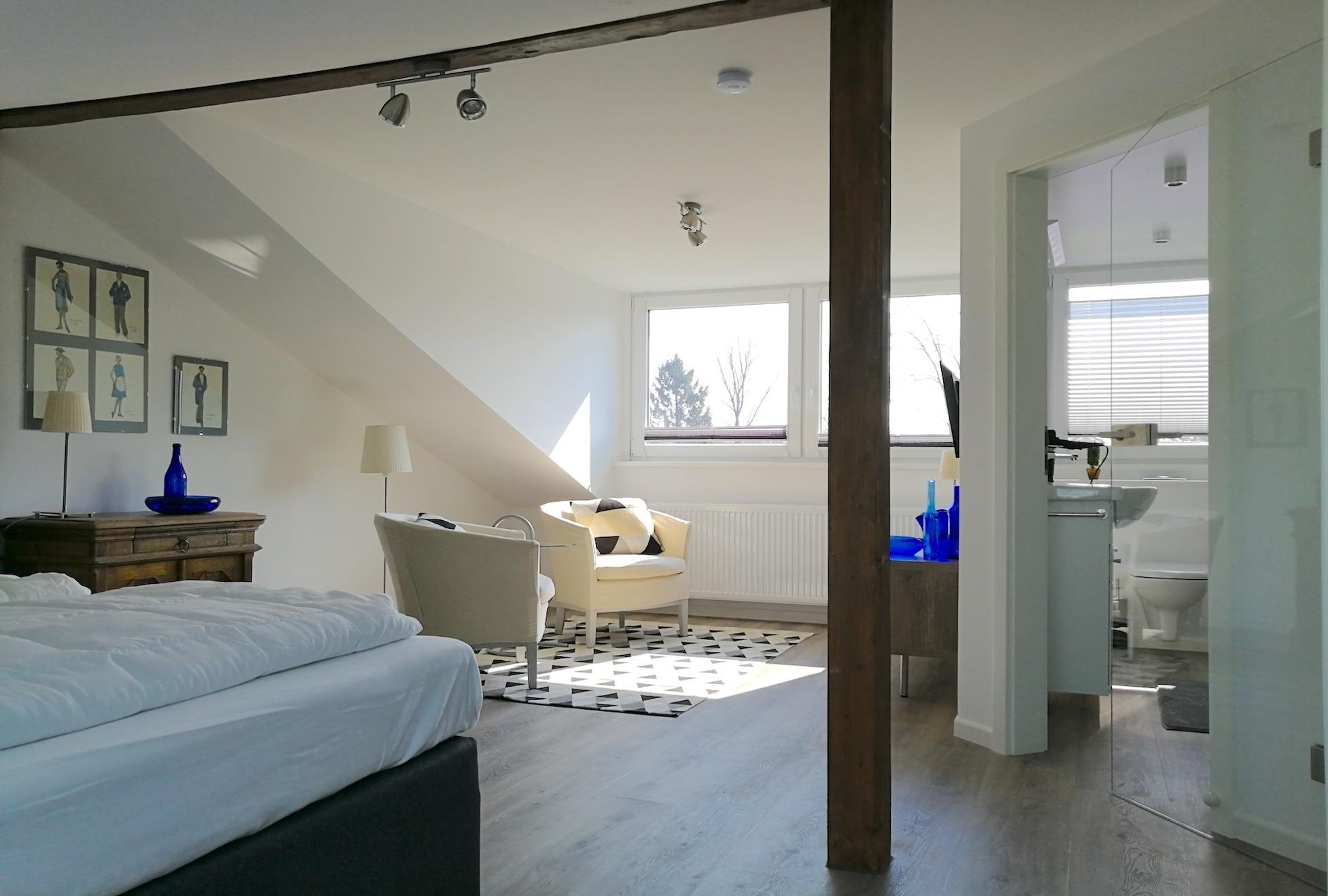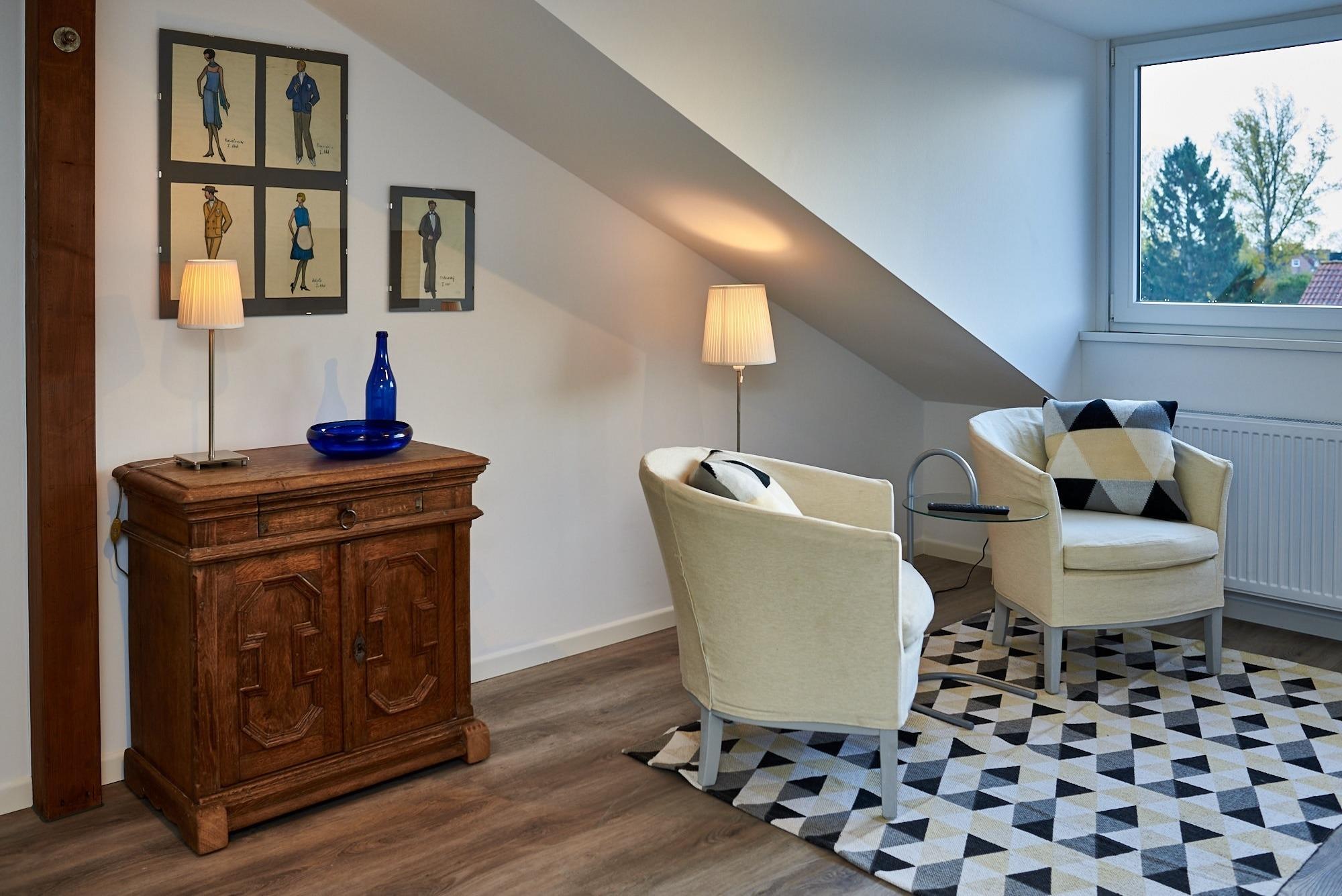 Die gemütliche 53 qm Ferienwohnung befindet sich im 1. Stockwerk mit Balkon und einem entspannten Blick auf dem Garten. Beim Betreten der Wohnung stehen Sie direkt im gemütlich eingerichteten Wohn- und Esszimmer. Die Küche verfügt über eine Einbauküche, in der Sie alle Dinge für den täglichen Gebrauch finden. vom kleinen Flur gelangen Sie über eine Treppe zum Schlafbereich direkt unterm Dach. Sofort fallen die freigelegten Dachbalken auf, durch die der Raum sein urgemütliches Ambiente erhält. Hier ist ein erholsamer Schlaf garantiert, und man kann seine Erlebnisse vom Tag weiter träumen. Die Schlafzimmerfenster haben zur Verdunklung - Außenrolladen / Vorbaurolladen. Auch als Rückzugsort bietet das großräumige Schlafzimmer einen separaten Lese-und Fernsehbereich. Das Tageslichtbad ist weiß gefliest und verfügt über eine Dusche. Ferner ist die Ferienwohnung mit sämtlichen Putzmitteln ausgestattet. Gemeinschaftsbereich mit der Kakabelle 1 zusammen. Der gesamte Garten, 2 Sonnenliegen, 2 Gartenstühle, Grillplatz, Garage für Fahrräder. Waschmaschine, Wäscheständer, Bügelbrett, Bügeleisen und Staubsauger, Auflagen für die Gartensonnenliegen befinden sich im Gartenabstellraum.
