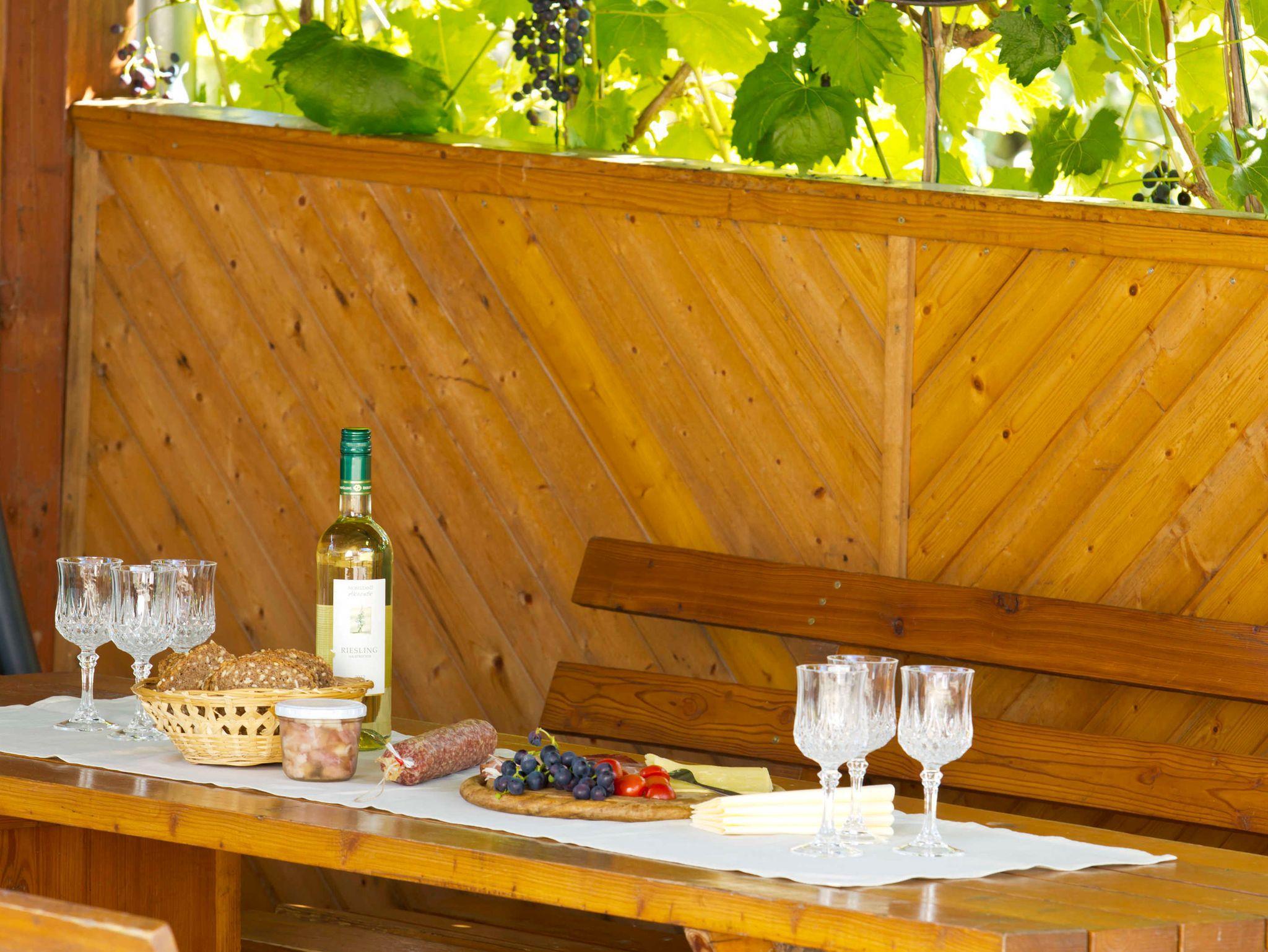 Liegewiese, überdachte Weinlaube mit Grillmöglichkeit, Parkplätze vorm Haus, Gefriermöglichkeit und Leihfahrräder runden das Angebot ab.