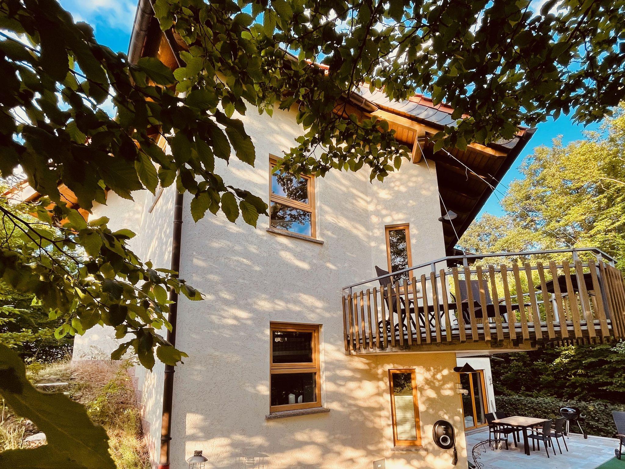 Erst wenn Sie die Einfahrt des Grundstücks betreten, können Sie hinter einem lichten Buchenwäldchen einen ersten Blick auf das in einem mediterran anmutenden Stil erbaute Haus erlangen. Das massiv erbaute Haus hat zwei Wohneinheiten mit separaten Eingängen. Die Wohnung im Erdgeschoß wird an Feriengäste vermietet, die Wohnung im Ober- und Dachgeschoß wird von den Eigentümern genutzt.