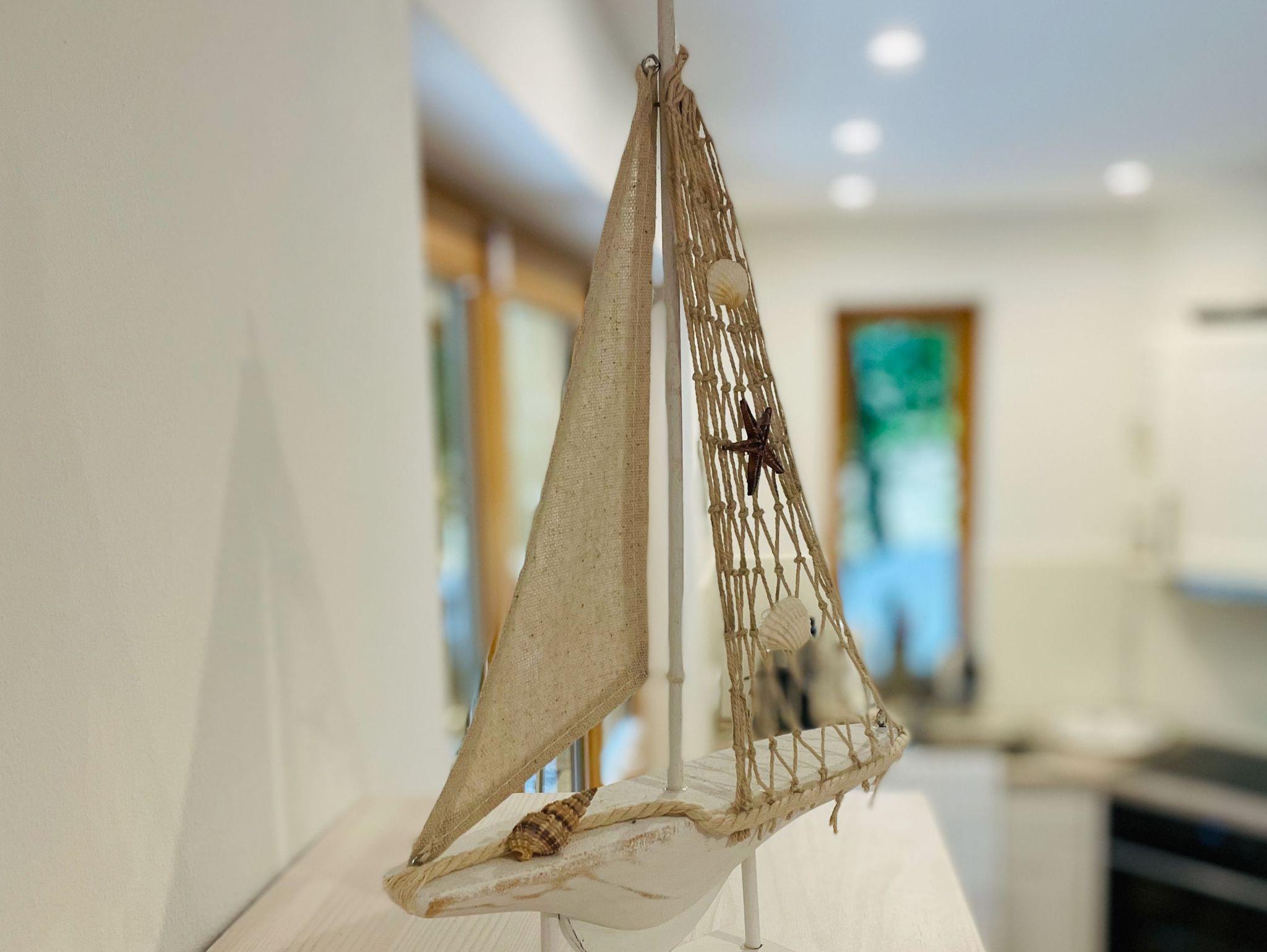 Rechterhand liegt der grosse, rundum verglaste Wintergarten, geradeaus geht es in den in hellen Farben gehaltenen offenen Wohn- und Küchenbereich. Die Fussböden der gesamten Wohnung sind mit italienischen Terracottafliesen belegt, alle Wände mit einem hellen Kalkputz versehen und die Türen weiss lackiert. Maritime Akzente in Wohnraum, Küche und Bad stellen eine Verbindung zum Wasser und dem See her.
