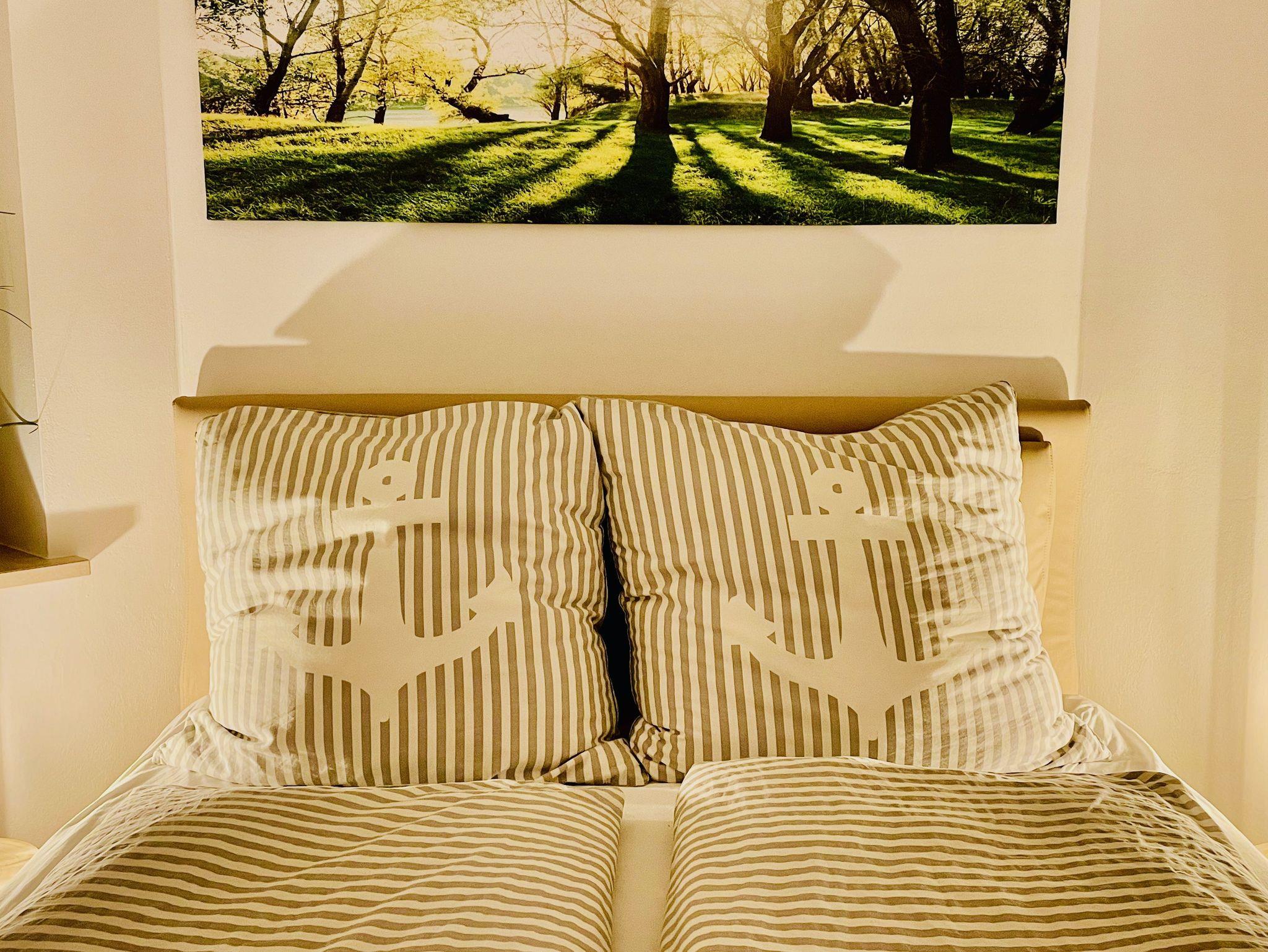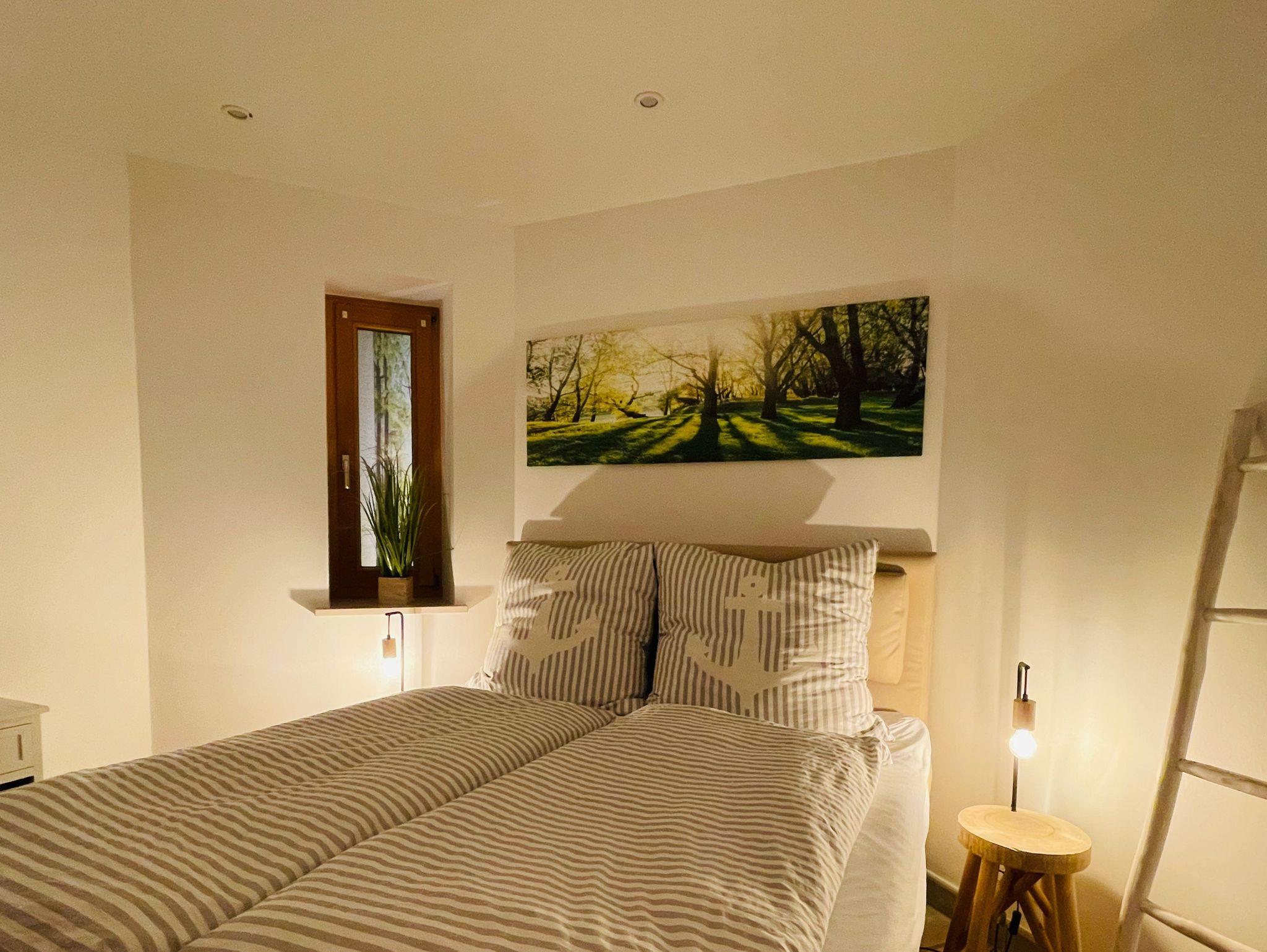 Durch eine Wand mit beleuchteten Bullaugen liegt abgetrennt vom Wohnraum der Schlafbereich der Wohnung. Ein bequemes Boxspringbett in 160 cm Breite mit Matratzen unterschiedlicher Härtegrade verspricht ruhigen und erholsamen Schlaf. Hier dominieren Erd- und Grüntöne und stellen einen Bezug zum nahen Wald her. Auch im beleuchteten Aussenlichtschacht findet sich das Waldmotiv wieder.