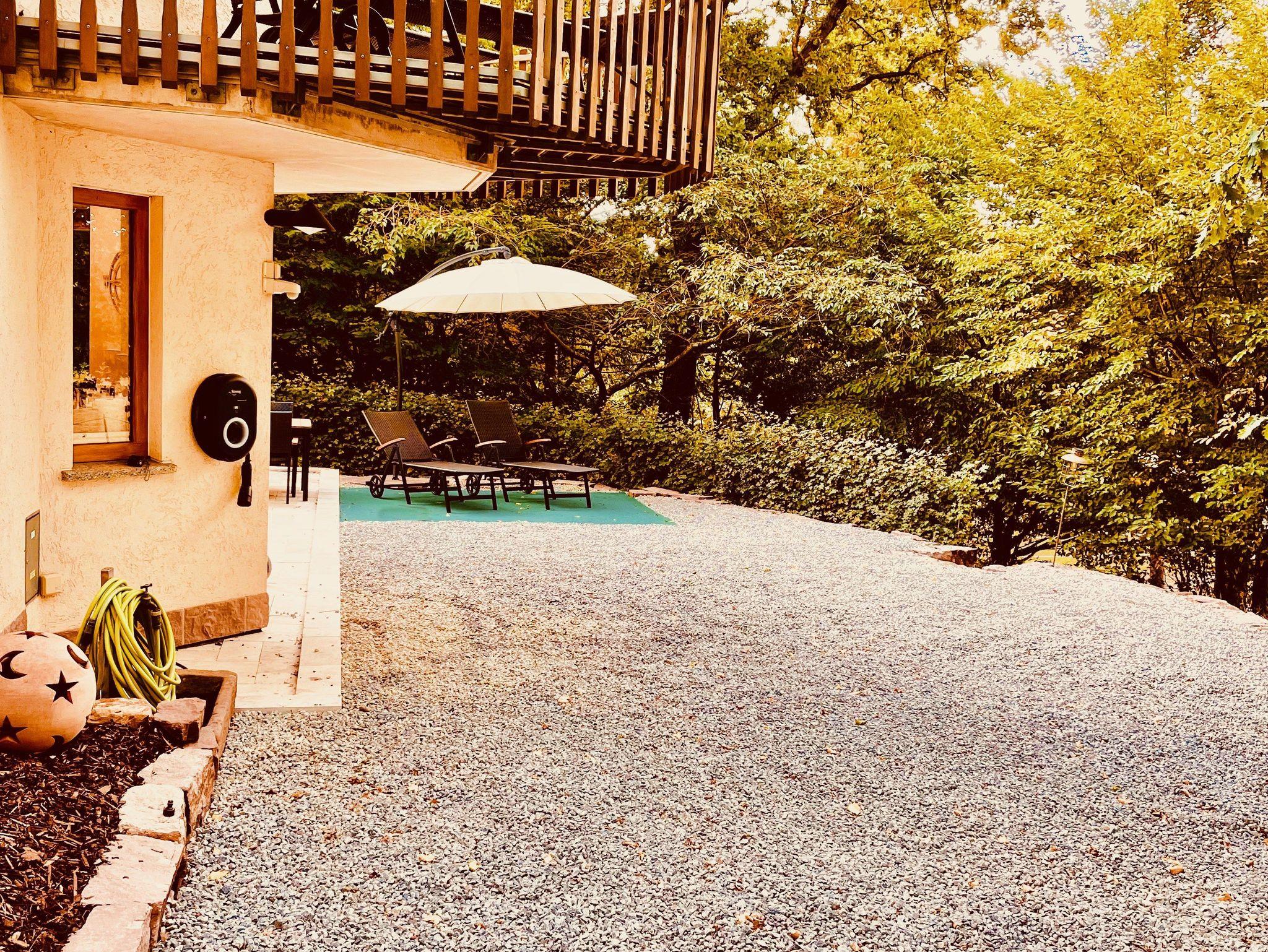 Ein ebener Kiesweg führt Sie unter Bäumen entlang zur Südwestseite des Hauses. Dort gelangen Sie über eine große, mit Travertin belegte Terrasse zum Eingang der Ferienwohnung. Um den Wintergarten herum führt ein schmaler Weg auf eine weitere Terrasse auf der Südostseite des Hauses.