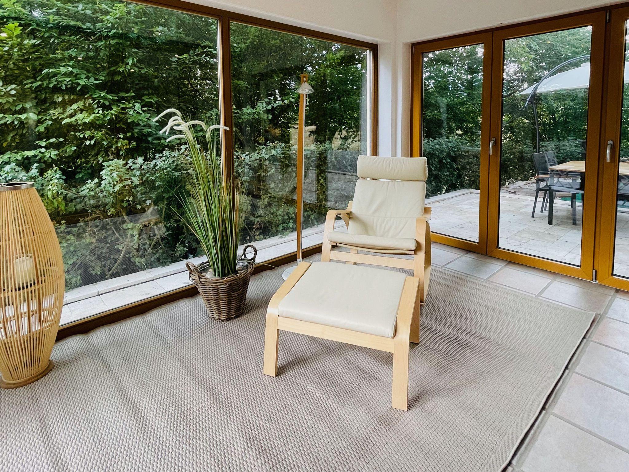 Das Licht wird Sie den gesamten Tag in der Wohnung begleiten. Morgens scheint es bereits durch die Fenster des Wintergartens hinein und wandert im Laufe des Tages um das Haus herum bis abends die letzten Strahlen der Sonne auf der Terrasse und in der Küche den Tag verabschieden. Trotzdem ist die Wohnung auch an heissen Tagen durch die schattenspendenden Bäume auch ohne Klimatisierung angenehm kühl.