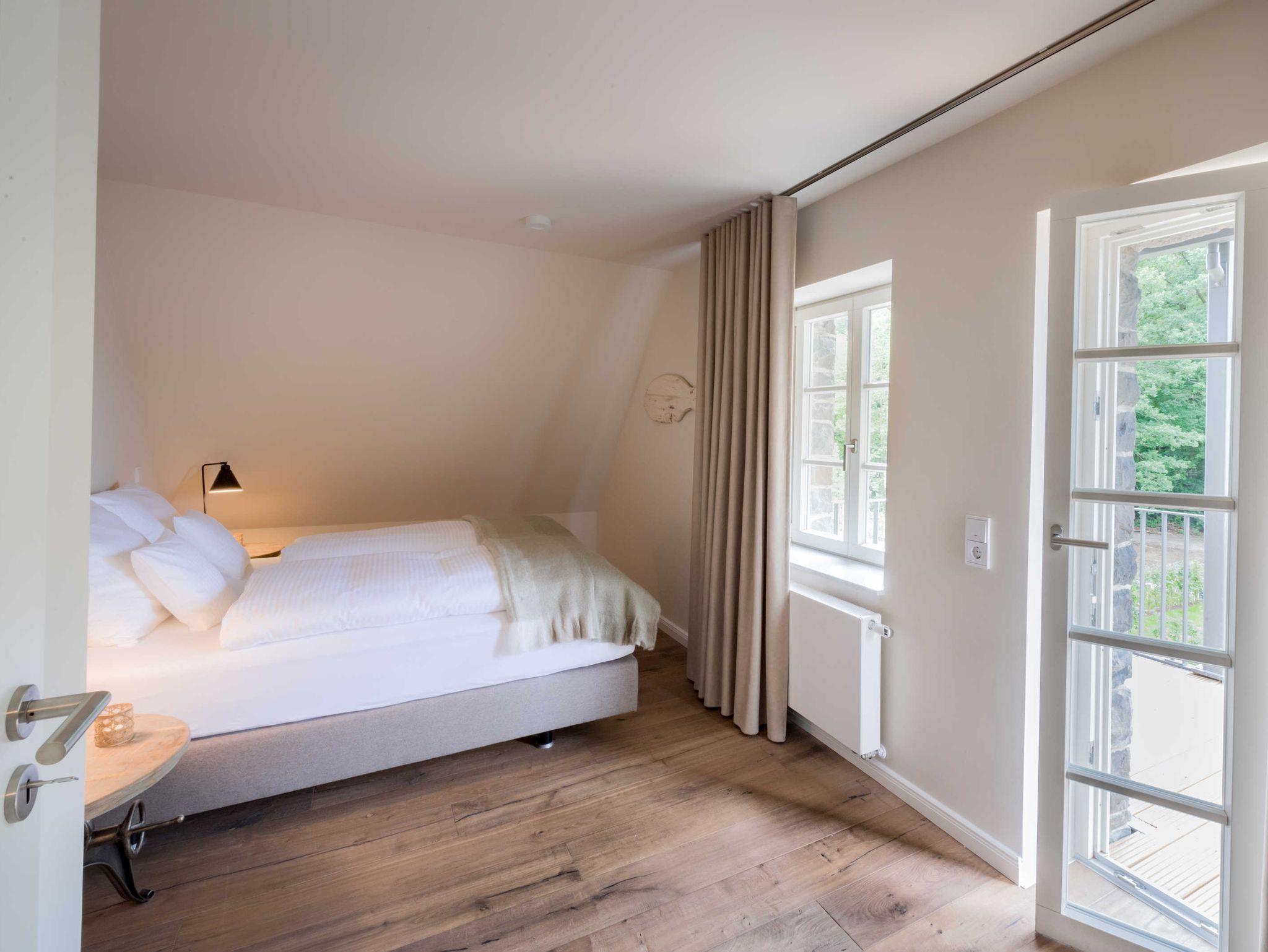 Das Schlafzimmer verwöhnt den Gast mit einem tollen Boxspringbett und dem Zugang auf den eigenen großen Holzbalkon. In dem anschließenden offenen Wohnbereich erwartet den Urlauber ein wunderschönes Sofa, das mit wenigen Handgriffen in ein sehr komfortables Bett für zwei Personen umgewandelt werden kann.