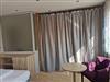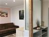 Schlafcouch im Wohnzimmer (Liegefläche 1,60m x 2,00m). Im Wohnzimmer ist ein Raumteiler mit blickdichtem Glas und Gardinen angebracht worden. Dies ermöglicht es, das Wohnzimmer auch als separates Schlafzimmer zu nutzen.