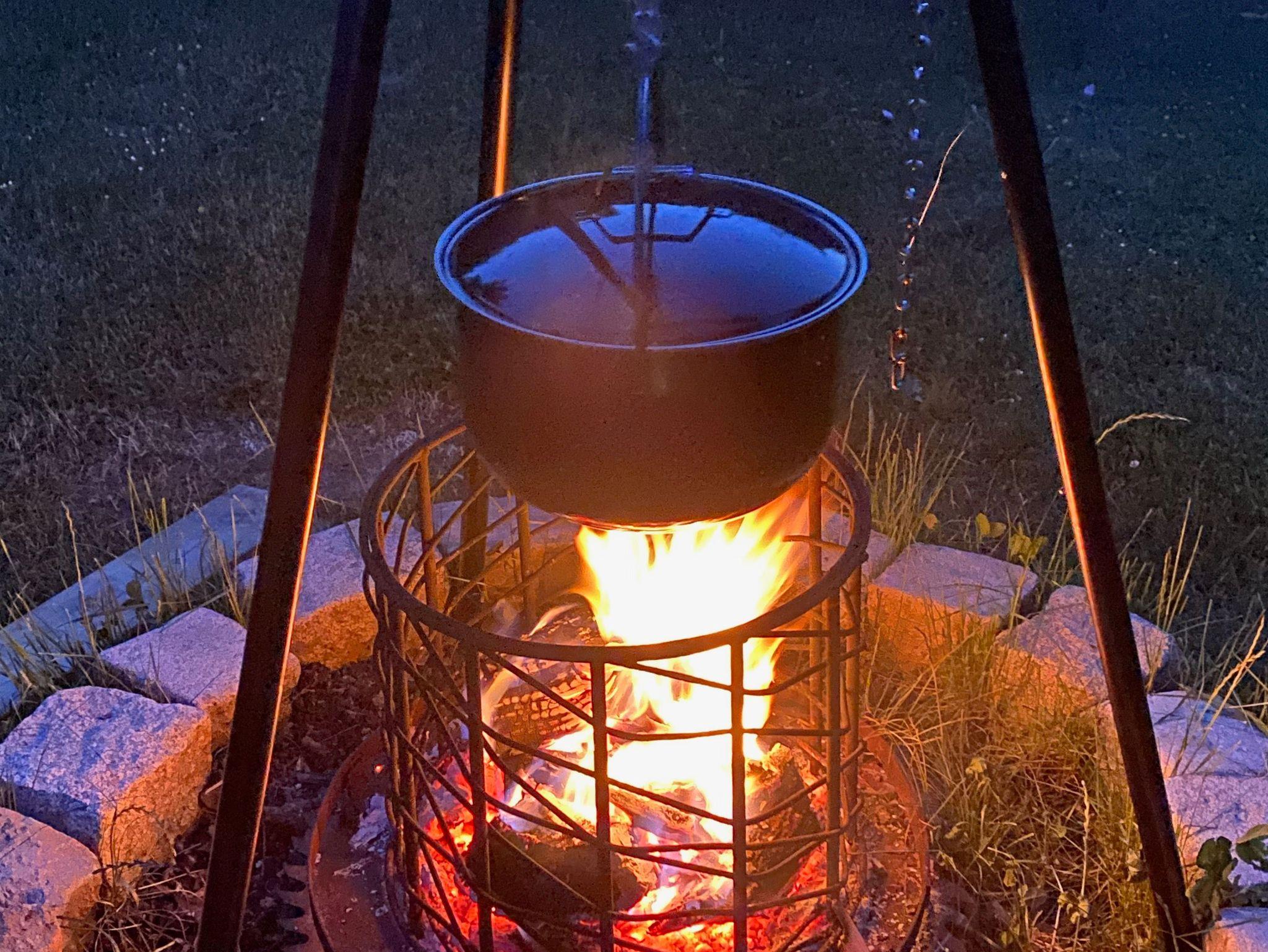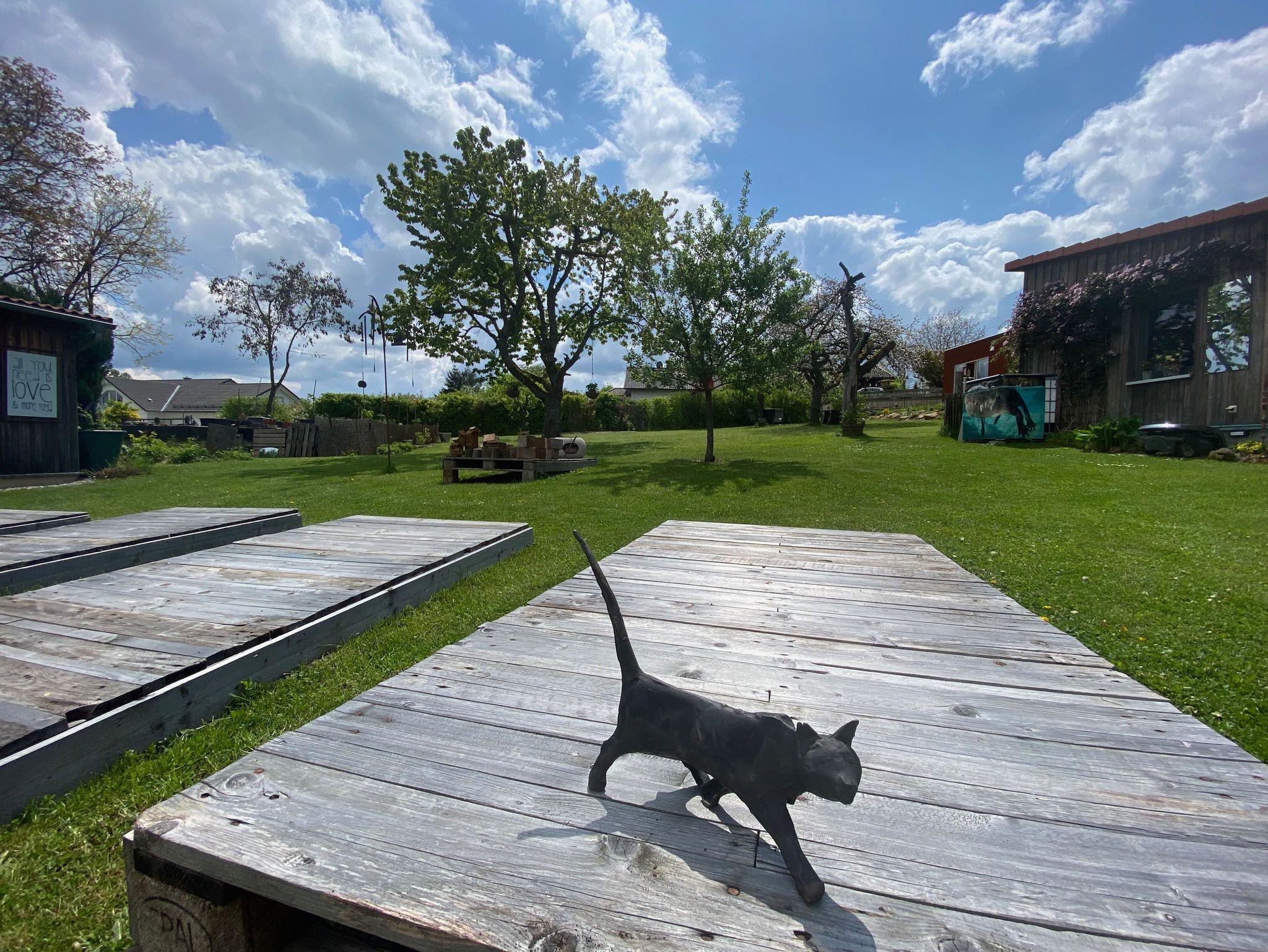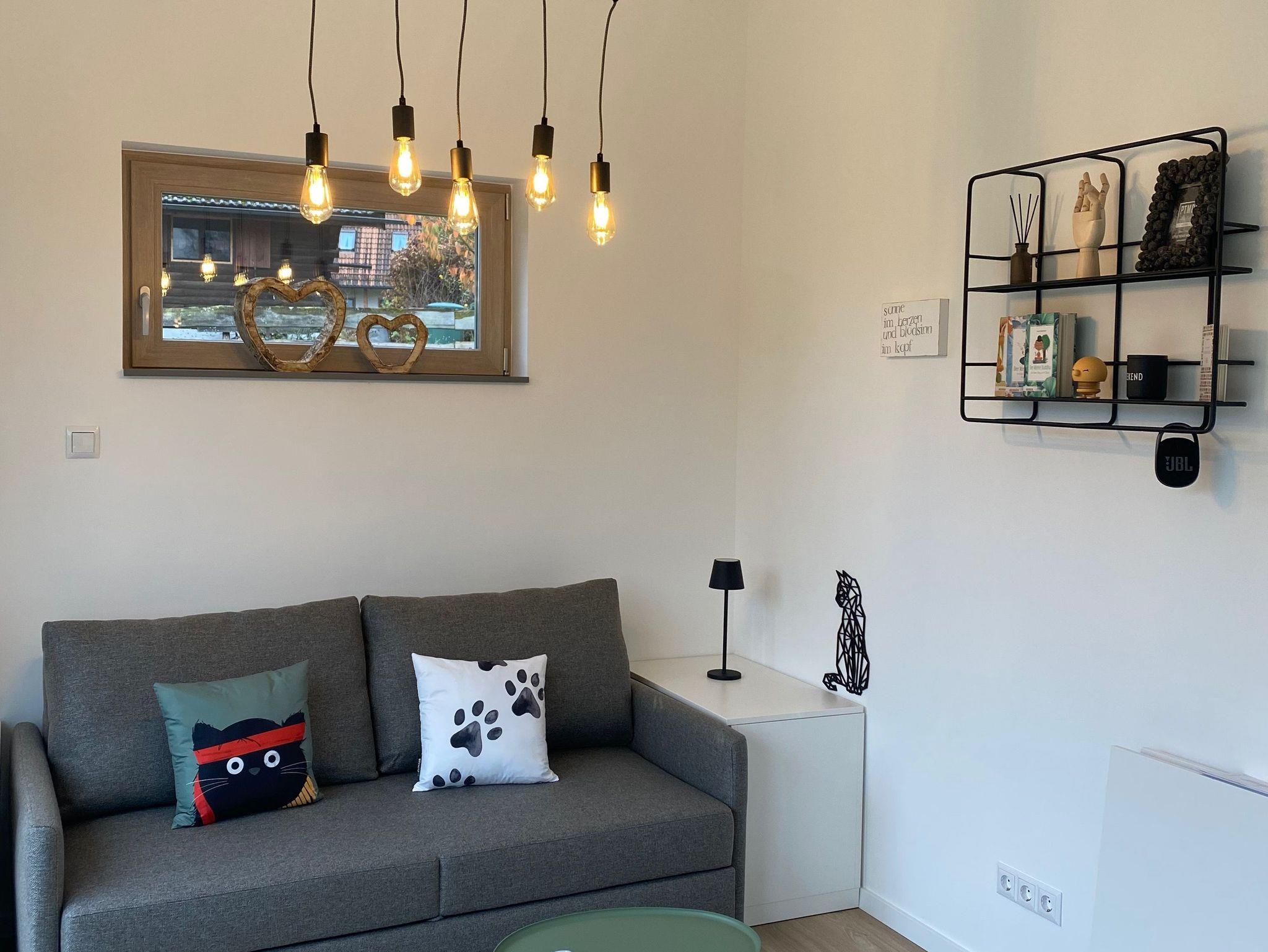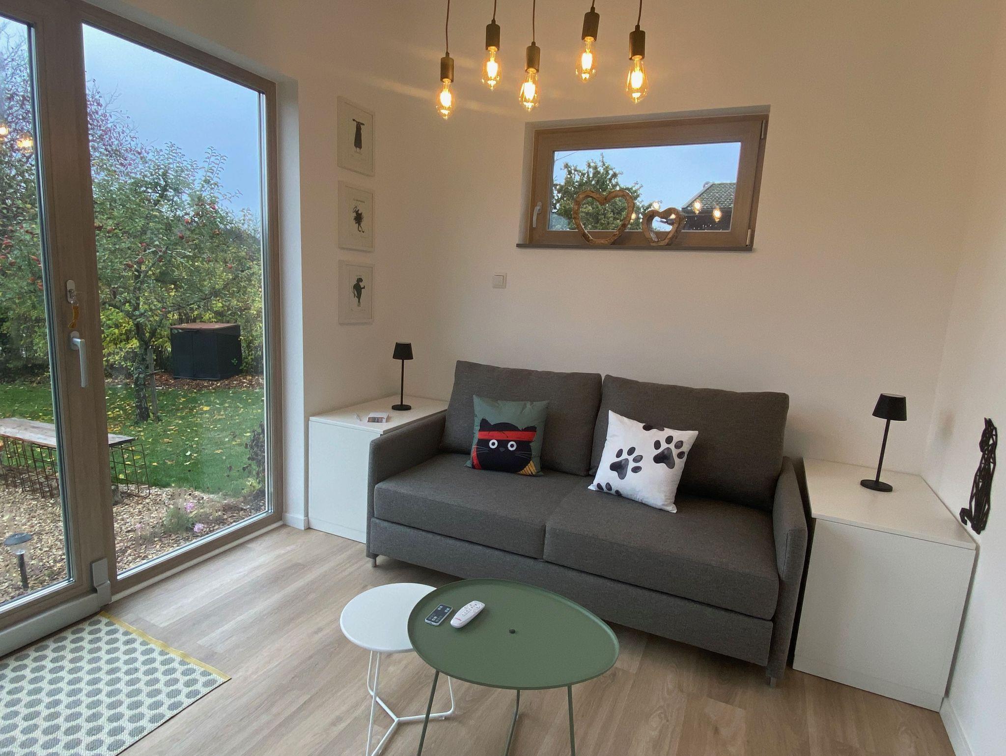 Vom Hotelschlafsofa/Chillarea (160×200) über Esstisch, Küchenzeile, großzügigem Bad und großen Kleiderschrank, verfügt unser Tiny House über alles, was man für ein paar entspannende Tage benötigt. Ein großer Tisch unter dem Apfelbaum, Gartenliegen und eine Feuerstelle mit Grill und Suppentopf laden zum verweilen in der Natur ein.