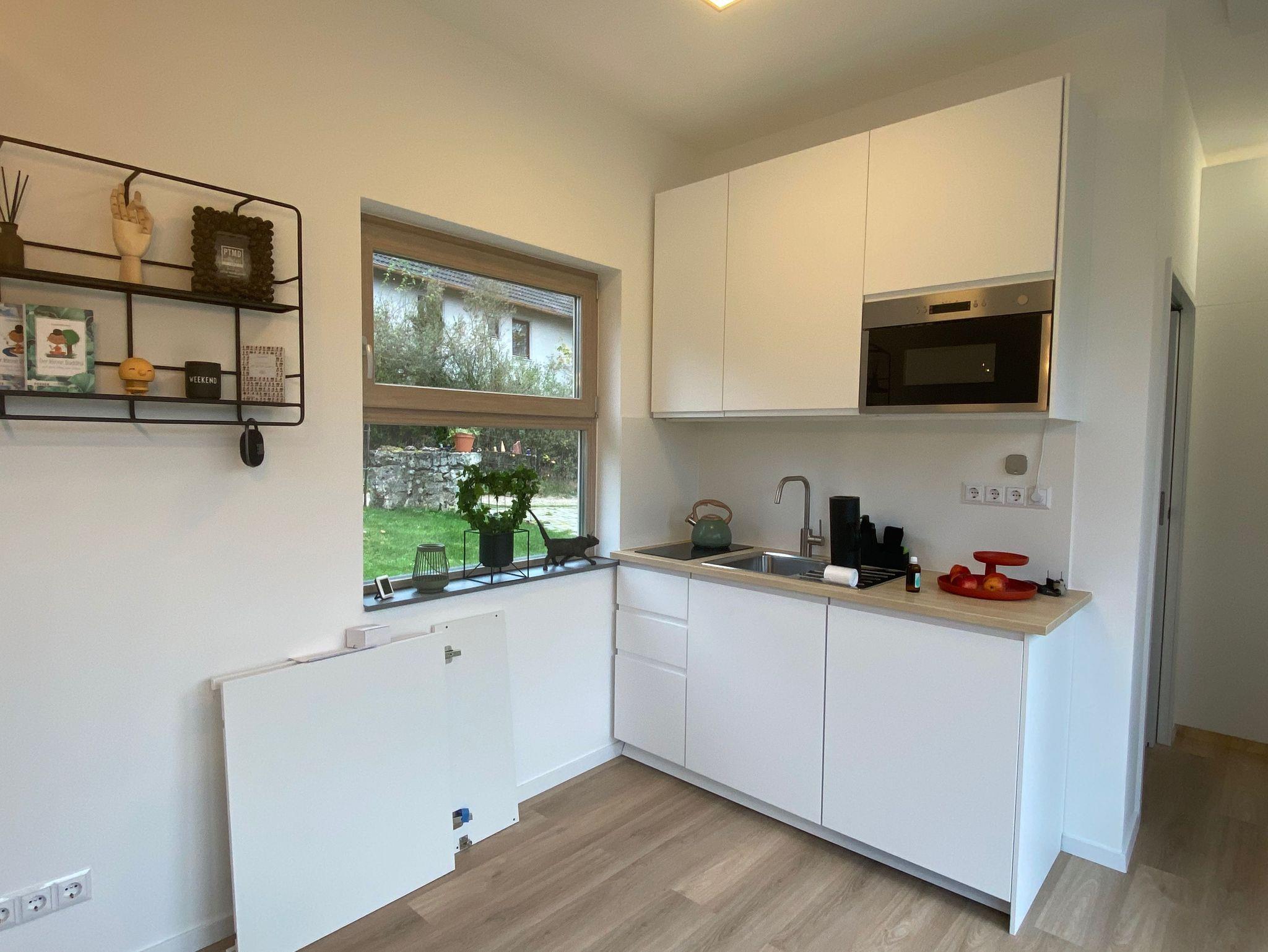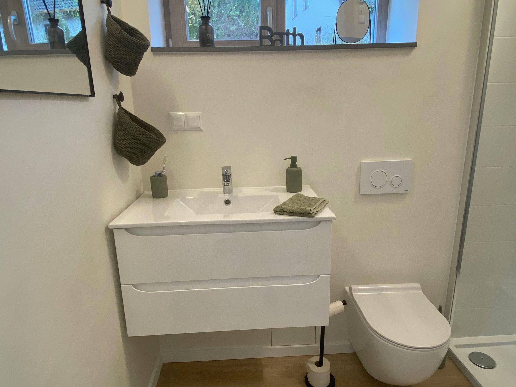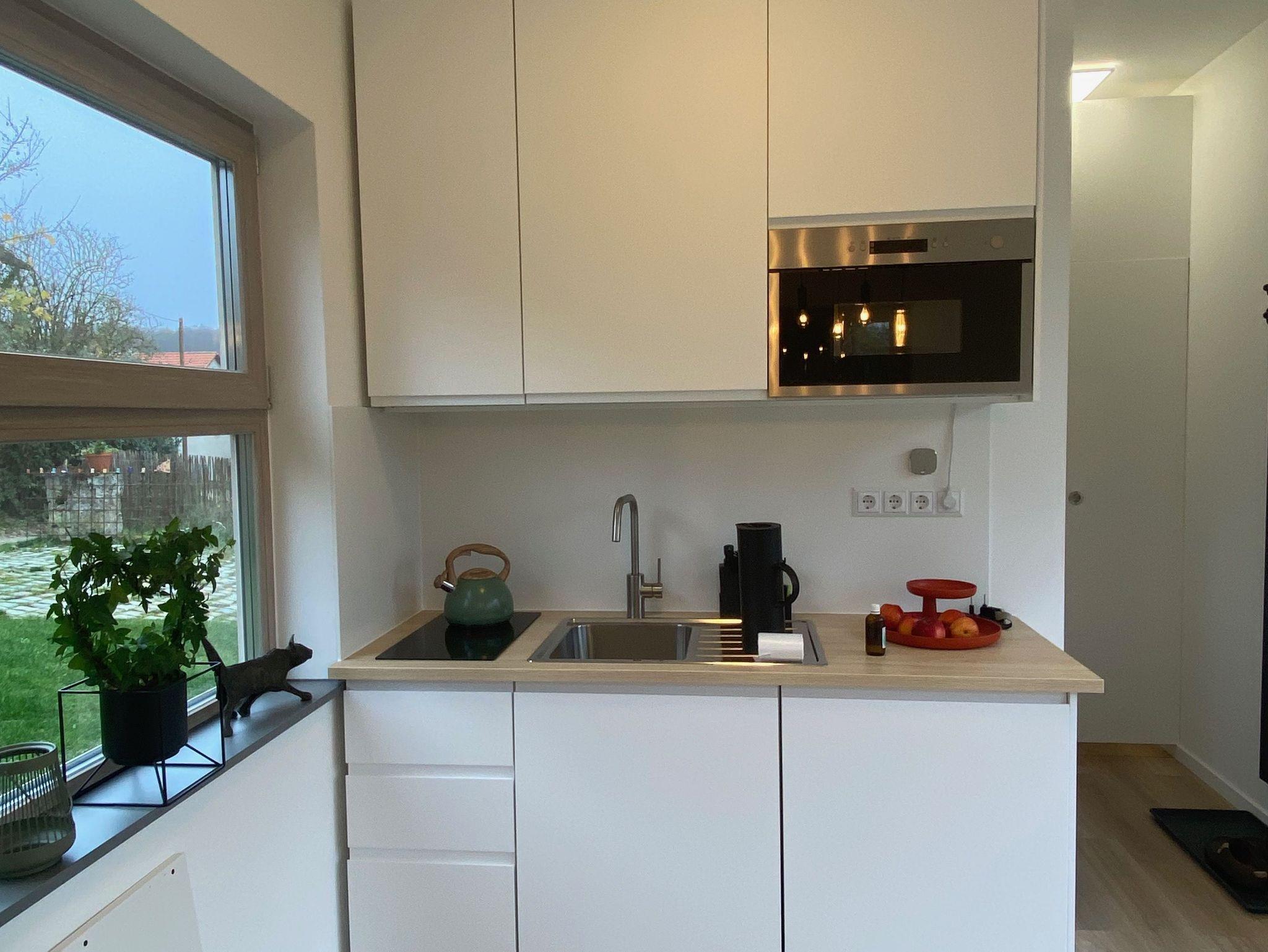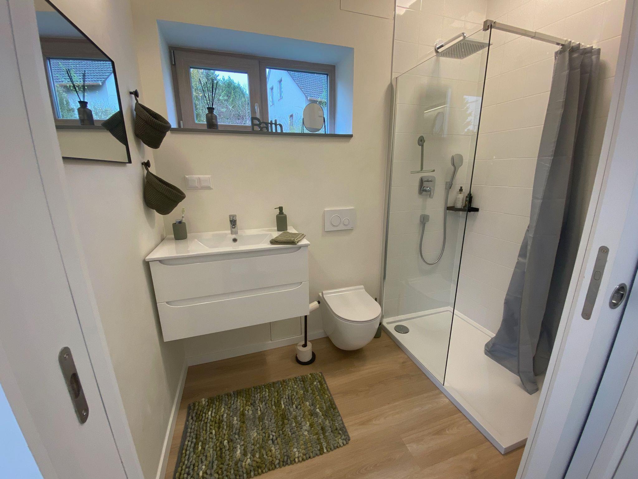 Vom Hotelschlafsofa/Chillarea (160×200) über Esstisch, Küchenzeile, großzügigem Bad und großen Kleiderschrank, verfügt unser Tiny House über alles, was man für ein paar entspannende Tage benötigt. Ein großer Tisch unter dem Apfelbaum, Gartenliegen und eine Feuerstelle mit Grill und Suppentopf laden zum verweilen in der Natur ein.