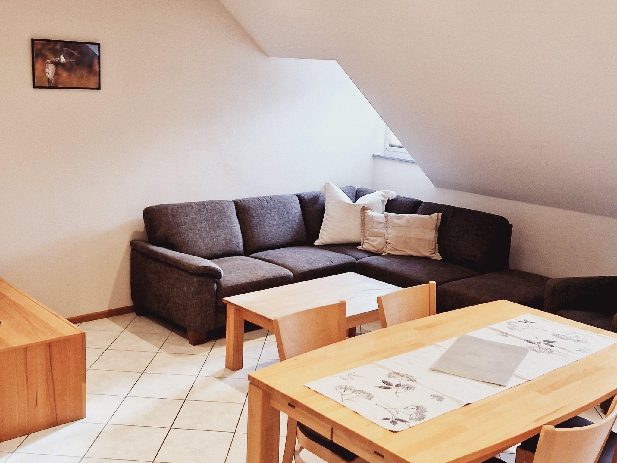 Auf ca. 80 m² hat die Ferienwohnung mit separatem Eingang ausreichend Platz für 2 - 4 Personen.Liegt im ersten Stock des Hauptbauernhauskomplex. Sie bietet Ihnen zwei Doppelzimmer, Baby-/Kinderausstattung ist vorhanden, eine Wohnküche mit Geschirrspüler, Kühlschrank/Eisfach, Elektroherd (4 Pl.), Mikrowelle, Radio, TV, Essecke sowie ein Bad mit Du/WC. Auf Wunsch können Sie Frühstückservice/Brötchenservice buchen. Eine Terrasse im Hofbereich, Bettwäsche und Handtücher sind vorhanden und Waschmaschinen- Mitbenutzung ist möglich.