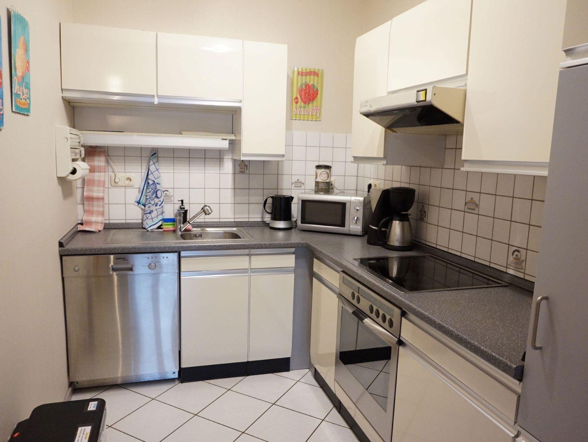 Die offene Küche ist vollständig ausgestattet mit einem Elektroherd incl, Backofen, Geschirrspüler, Kühlschrank mit Gefrierfach, Mikrowelle, Kaffeemaschine, Toaster, Geschirr, Töpfen ... Also mit allem, was Sie so brauchen.