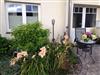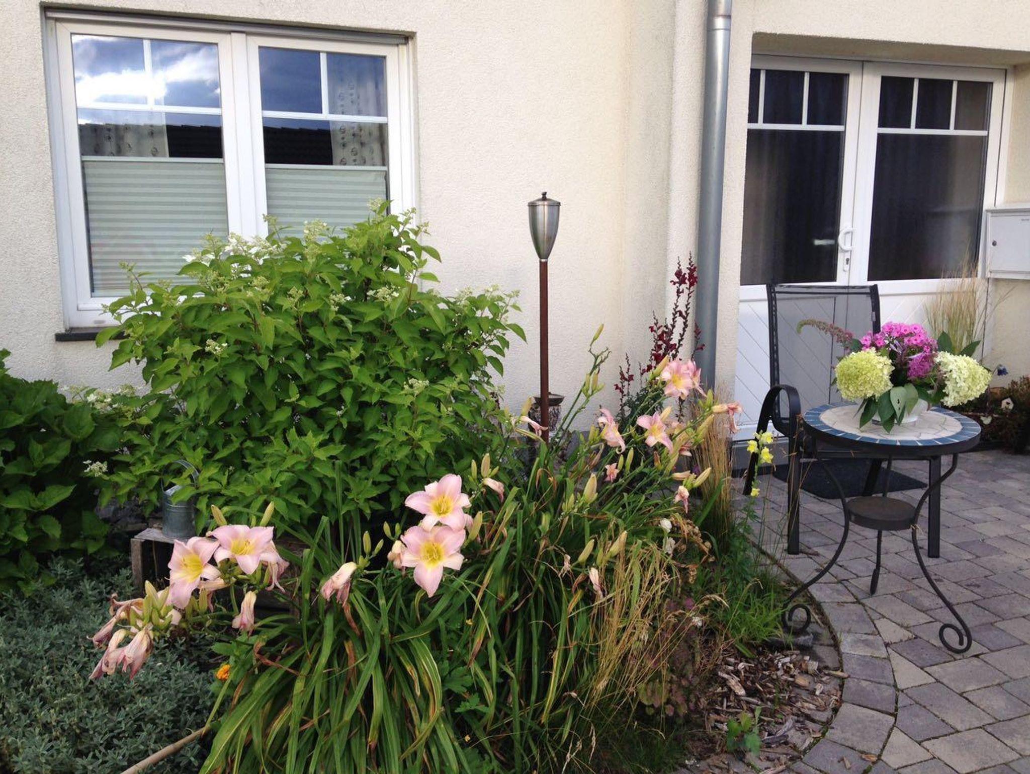 Aus dem lichtdurchfluteten Wohnzimmer schauen Sie direkt in einen kleinen Garten. Vor der Haustür laden 2 Gartenstühle zum Verweilen ein.