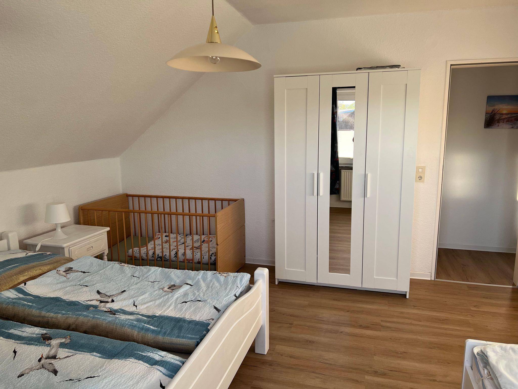 Die gemütliche Ferienwohnung im Obergeschoss umfasst großzügige 40 Quadratmeter und bietet ideale Bedingungen für einen erholsamen Aufenthalt. Das Schlafzimmer ist mit einem komfortablen Doppelbett und einem zusätzlichen Beistellbett ausgestattet. Für Familien mit Kleinkindern steht ein Gitterbett bereit, sodass ein Kind bis zu drei Jahren kostenlos mitreisen kann. Um das Gitterbett rechtzeitig herzurichten, bitten wir um vorherige Benachrichtigung.