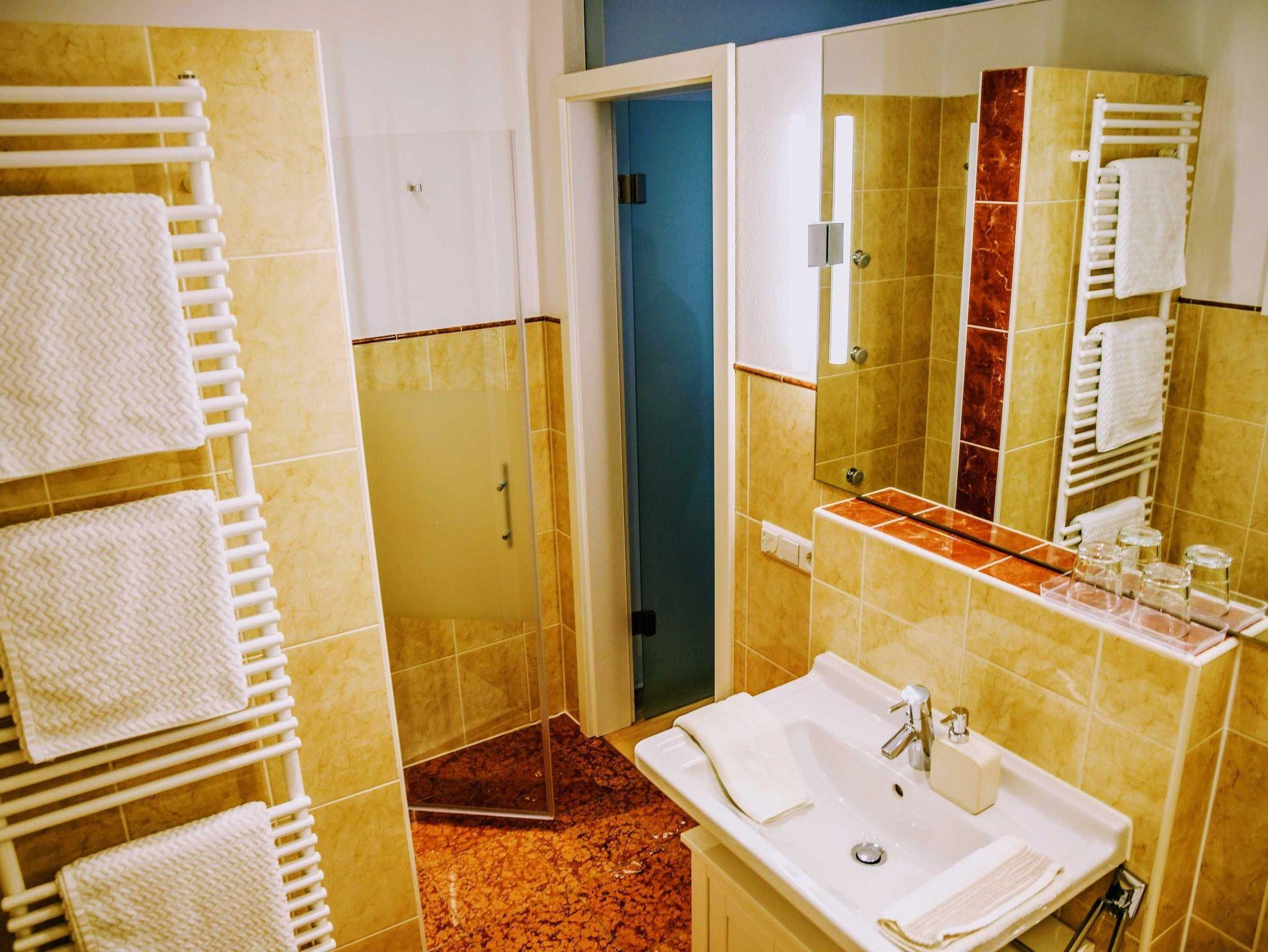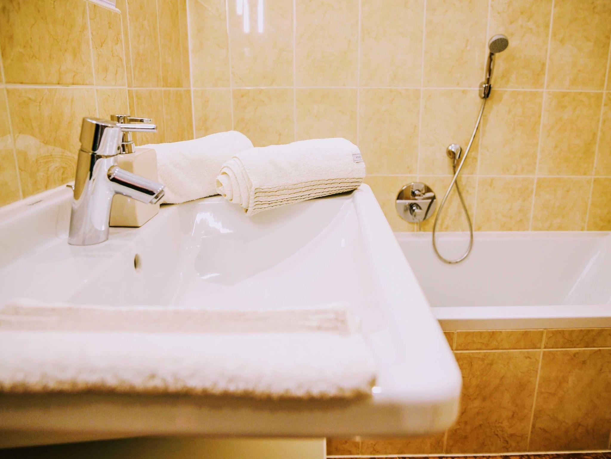 Luxuriöses Bad en Suite mit Badewanne, WC und toller Massagedusche.