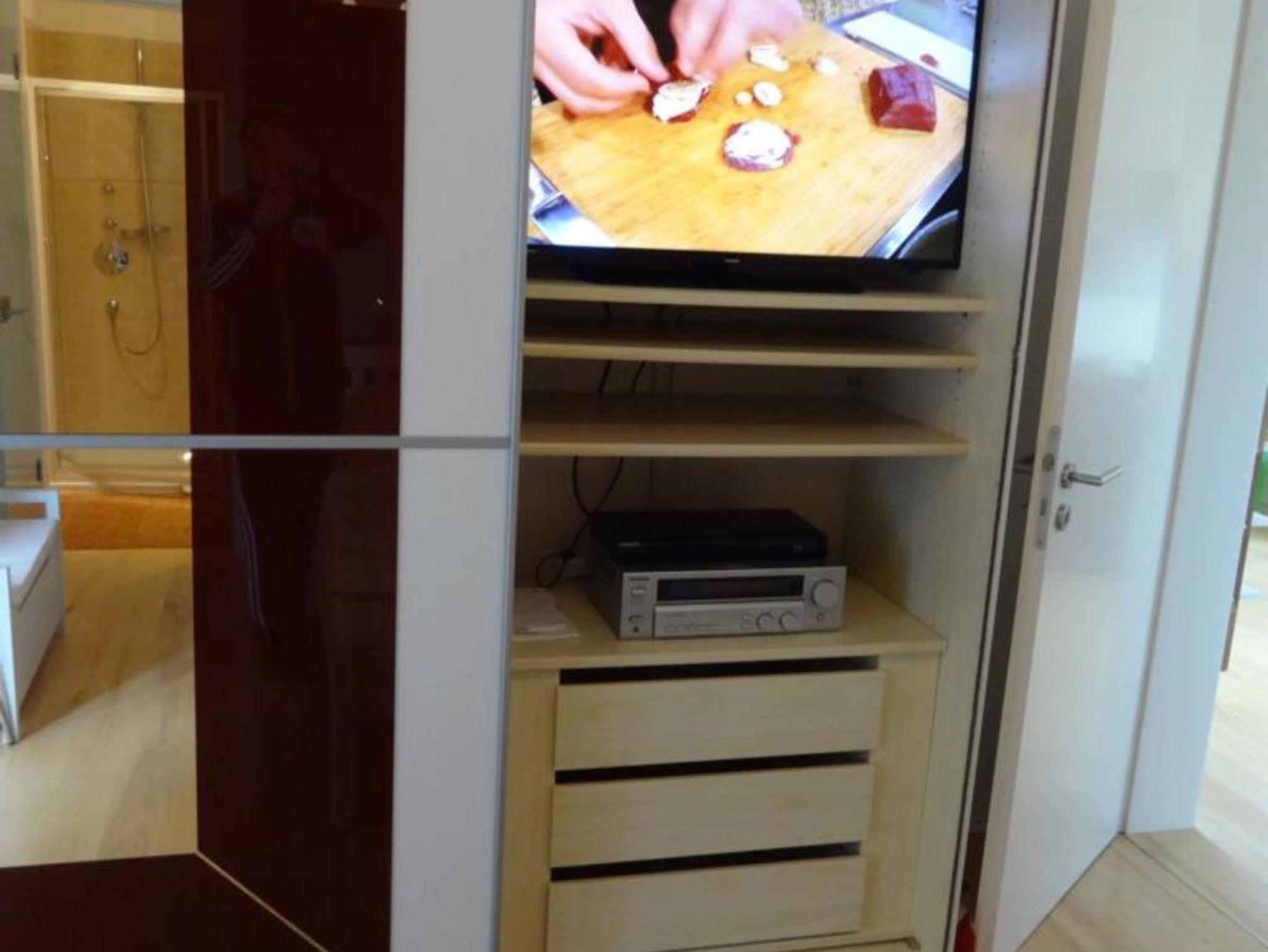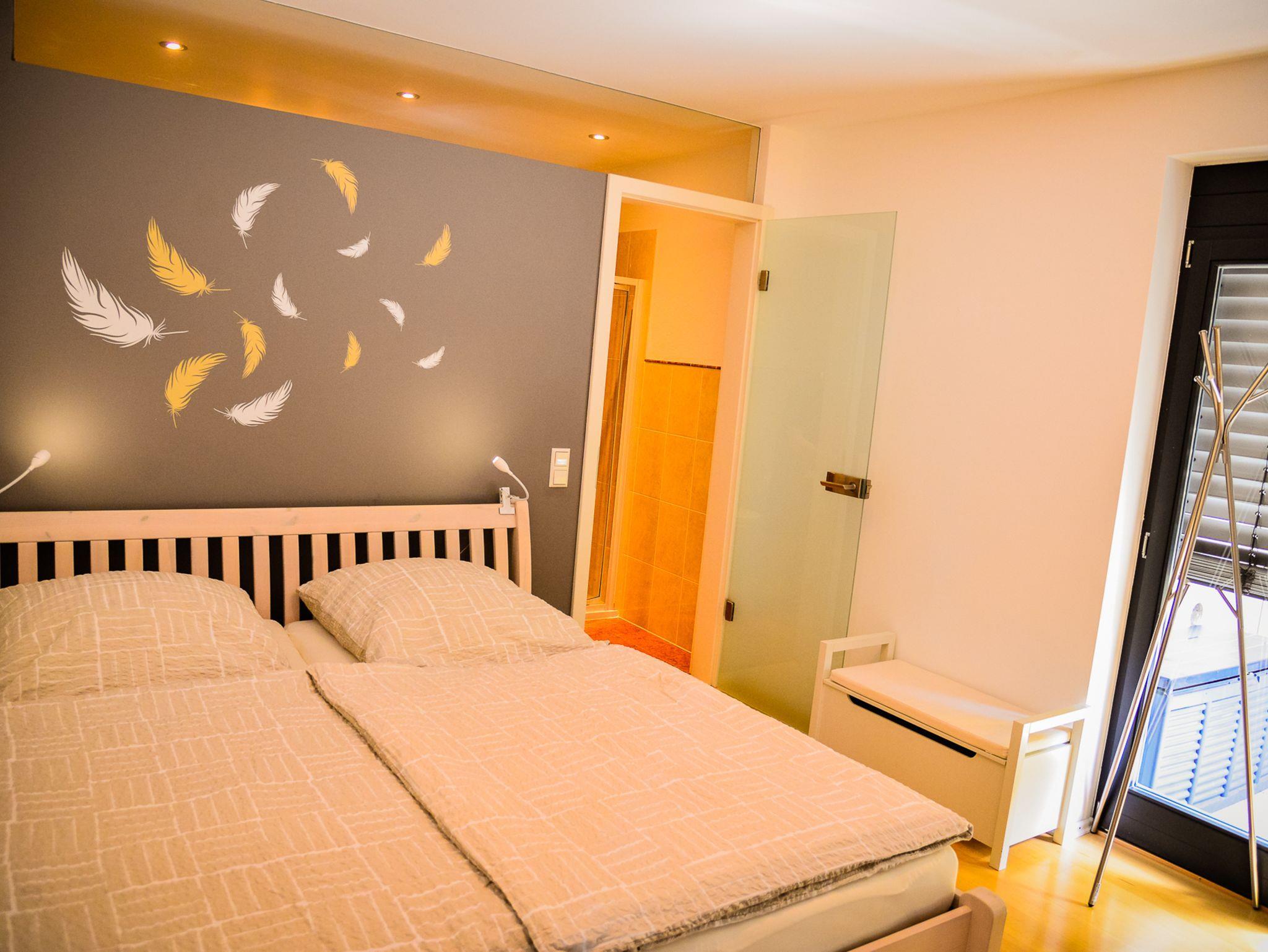 Schlafzimmer mit Boxspringbett (1,80m) sowie LED-TV und DVD Player, direkter Terrassenzugang.