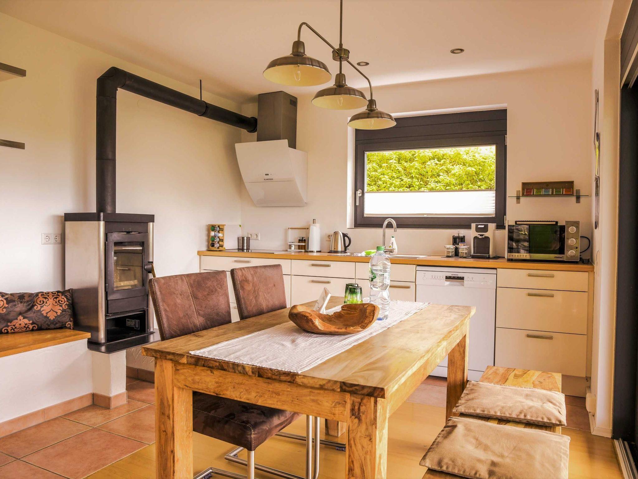 Moderner Wohn-/Essbereich mit großer Terrasse inklusive Gartennutzung, Schlafsofa (1,60m Liegefläche) für den 3. und 4. Gast, LED-TV sowie romantischer Schwedenofen für die kalten Tage (gegen Gebühr).