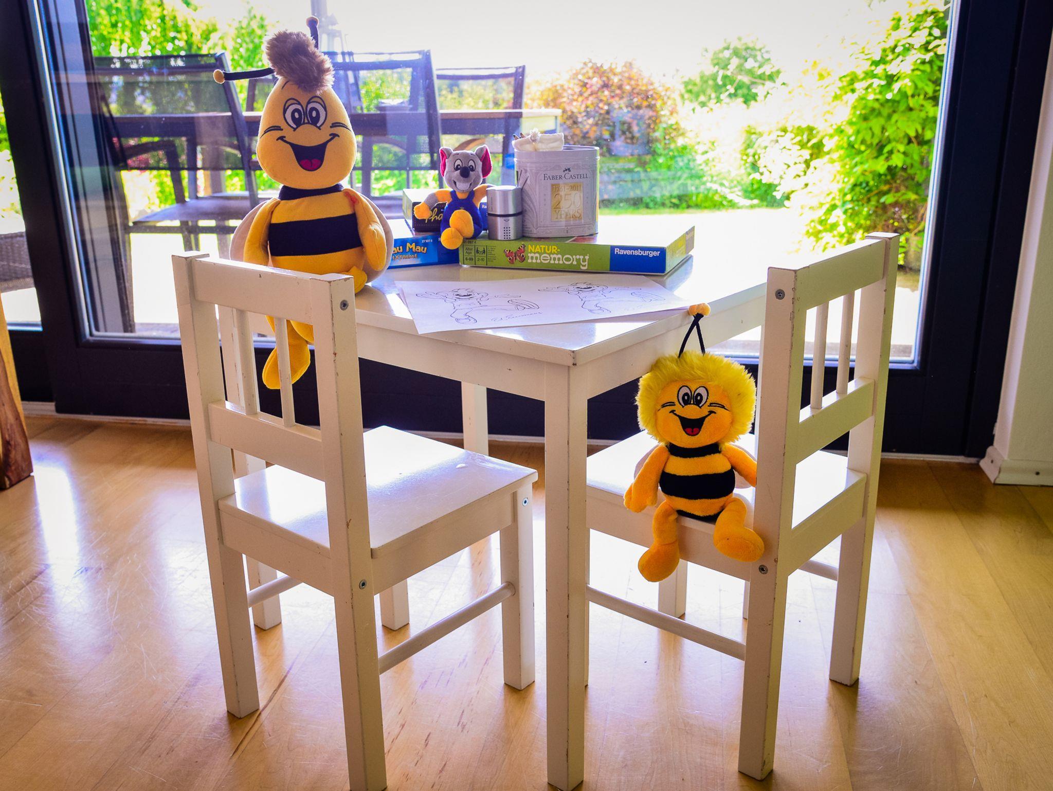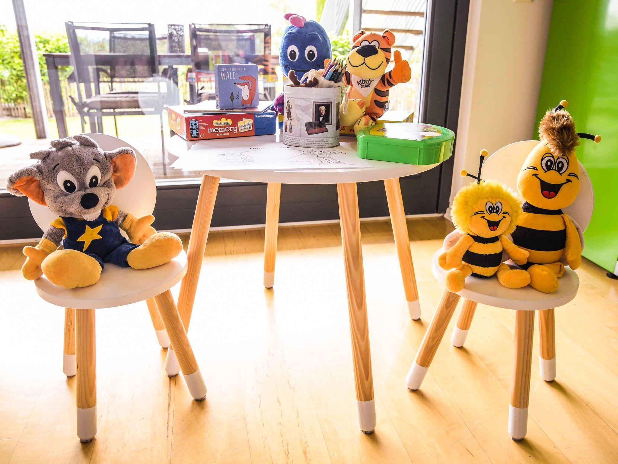 Kinderecke mit Spielsachen und höhen verstellbarem Hochstuhl für unsere kleinen Gäste.