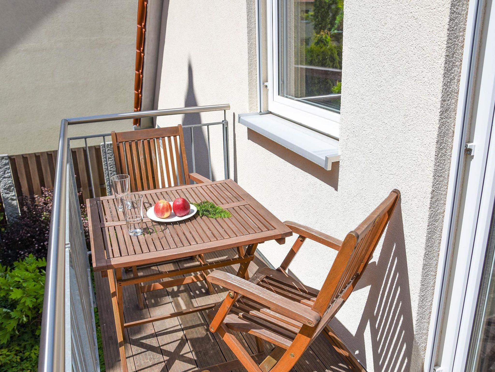 Die Wohnung befindet sich im Obergeschoss. 39 Quadratmeter Wohnfläche bieten Ihnen einen unvergesslichen Urlaub oder Aufenthalt. In dem Schlafzimmer befindet sich ein Doppelbett, ein kleiner Schrank und ein Flachbild Sat TV. Eine weitere Schlafmöglichkeit gibt es auf der Galerie mit zwei Einzelbetten + TV. Die Kochnische ist ausgestattet mit Kühlschrank, Kaffeemaschine, Küchenuntensilien, Wasserkocher und Kochfeld. Das Bad verfügt über eine Dusche, WC und Haartrockner. Das Highlight der Wohnung ist der Balkon mit Gartenmöbeln und Zugang über Schlafzimmer. WLAN nutzen Sie in allen Bereichen der Unterkunft kostenfrei. Privatparkplätze stehen an der Unterkunft ebenfalls zur Verfügung.
