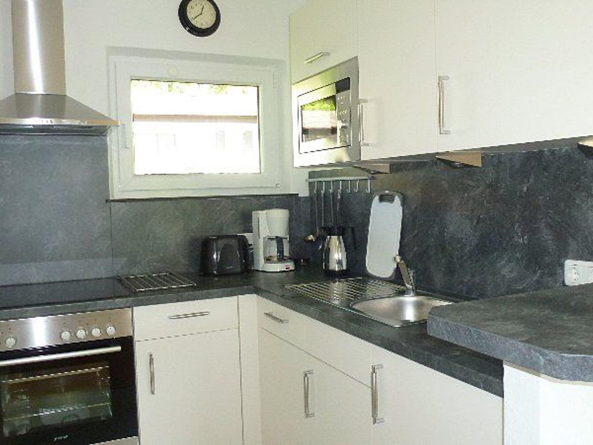 Es steht Ihnen eine moderne Küche mit allen üblichen Elektrogeräten wie Geschirrspüler, Mikrowelle, Herd mit Cerankochfeld, und ein Kühlschrank mit Gefrierfach zur Verfügung. Die Küche ist zum Wohnzimmer durch eine kleine Theke getrennt.