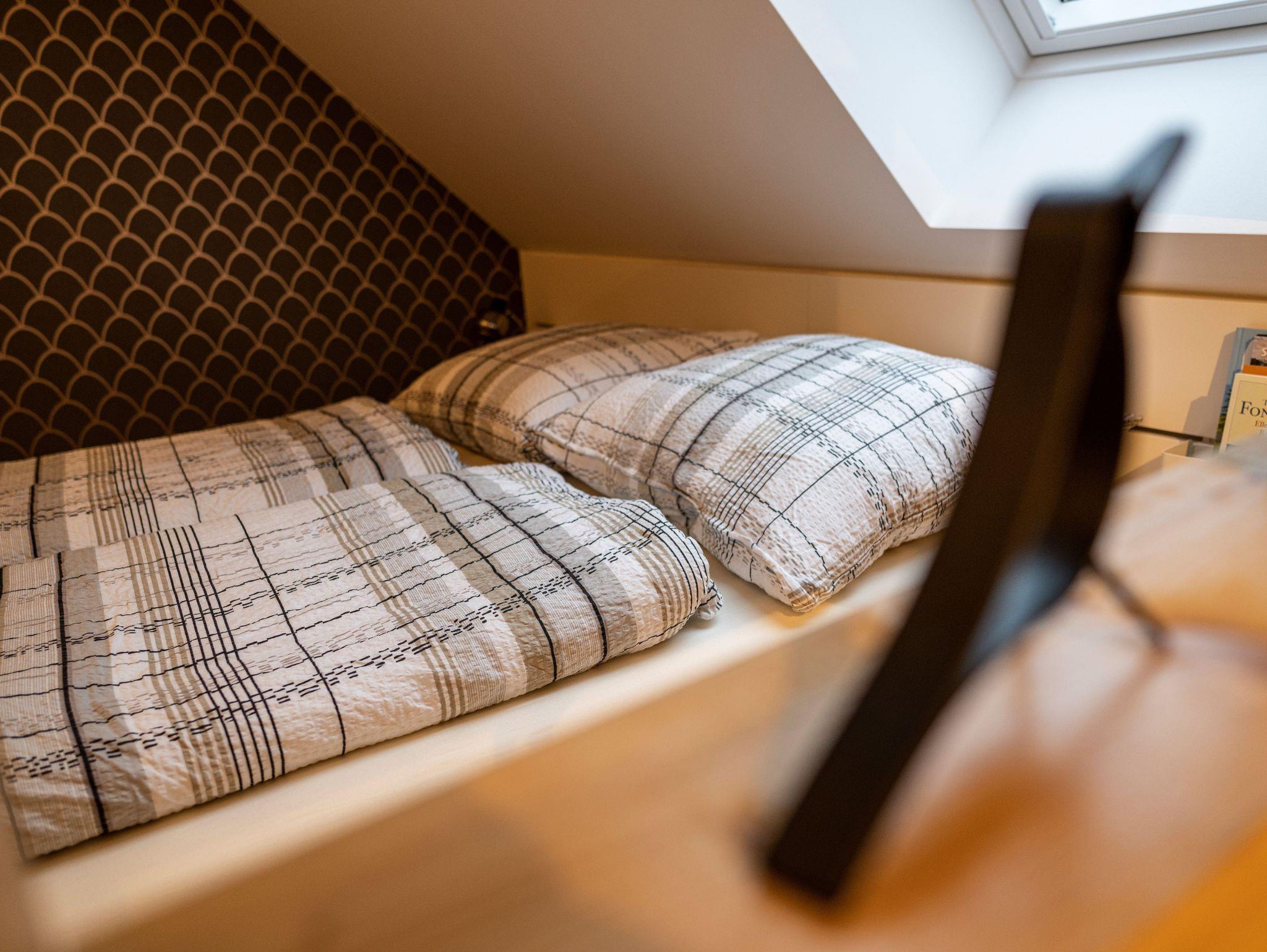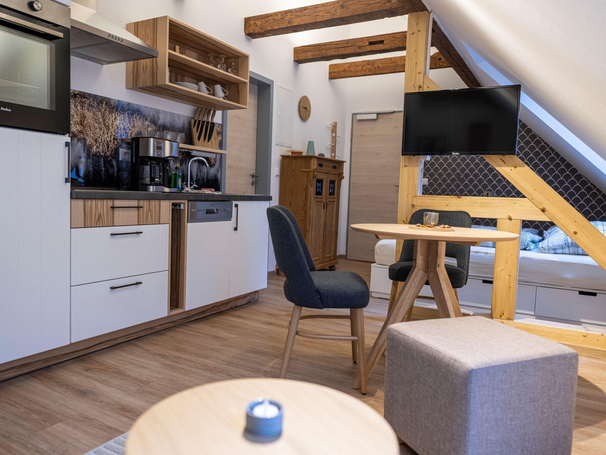 Hell und freundlich gestaltete Dachwohnung für 2 bis 3 Personen. Die Wohnung verfügt über einen großzügigen Wohn-/Schlafraum mit bequemem Sofa, Doppelbett sowie eine offene, gut ausgestattete Küche und ein Bad.