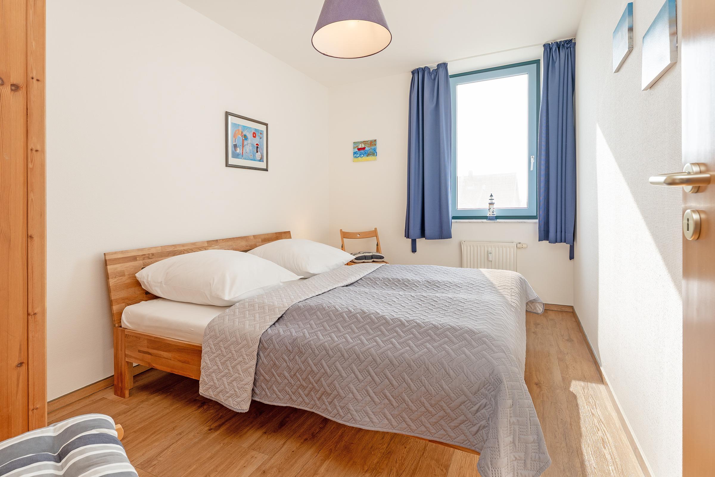 Schlafzimmer: 1 Doppelbett (2x 90x200 cm), Kleiderschrank, Verdunkelung: Gardinen