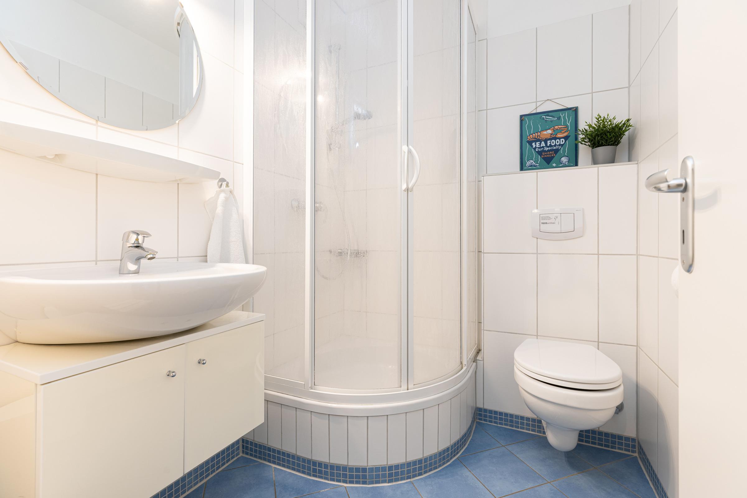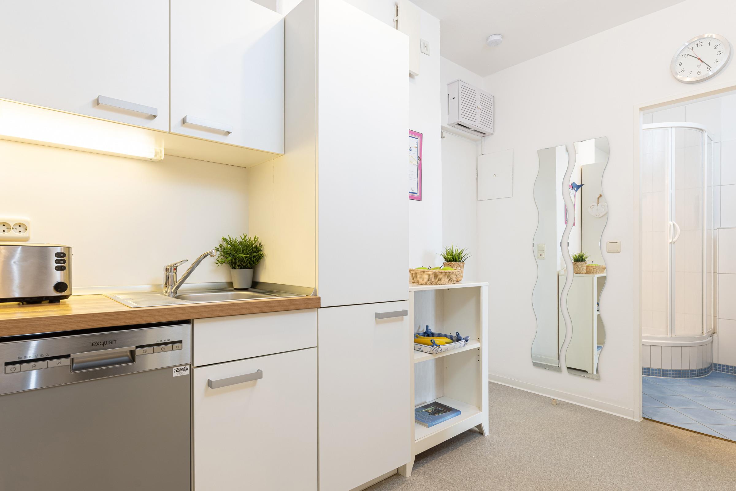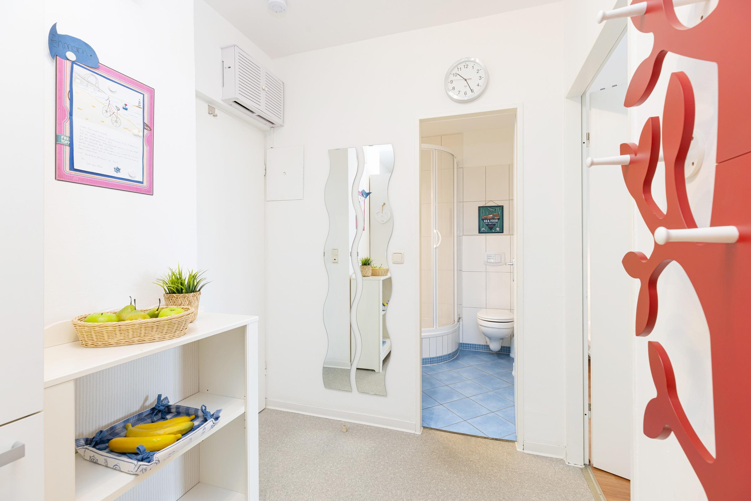 Die maritim eingerichtete Wohnung ist perfekt für einen erholsamen und unvergesslichen Urlaub auf Fehmarn. Die Wohnung ist modern und kinderfreundlich eingerichtet. Das gemütliche Wohnzimmer hat ein Ecksofa, einen Flachbildfernseher, ein CD-Radiogerät und eine integrierte Essecke sowie eine große Fensterfront mit Zugang zum Balkon. Von hier aus sind das Meer, die Hafeneinfahrt von Burgstaaken und die Fehmarnsundbrücke sehr gut zu erkennen. Der Balkon liegt zur Südseite, sodass Sie dort fast den ganzen Tag die Sonne genießen können. In der sehr gut ausgestatteten Küche finden Sie alles, um schmackhafte Speisen zuzubereiten sowie eine Mikrowelle, eine Kaffeemaschine, einen Wasserkocher und einen Toaster. Der Schlafbereich mit bequemen Doppelbett ist mit einer dezenten Trennwand vom Wohnzimmer abgeteilt. Im Kinderzimmer befinden sich zwei Einzelbetten, die auch für Erwachsene geeignet sind, sowie ein Tisch zum Spielen. Das Duschbad ist hellgefliest.