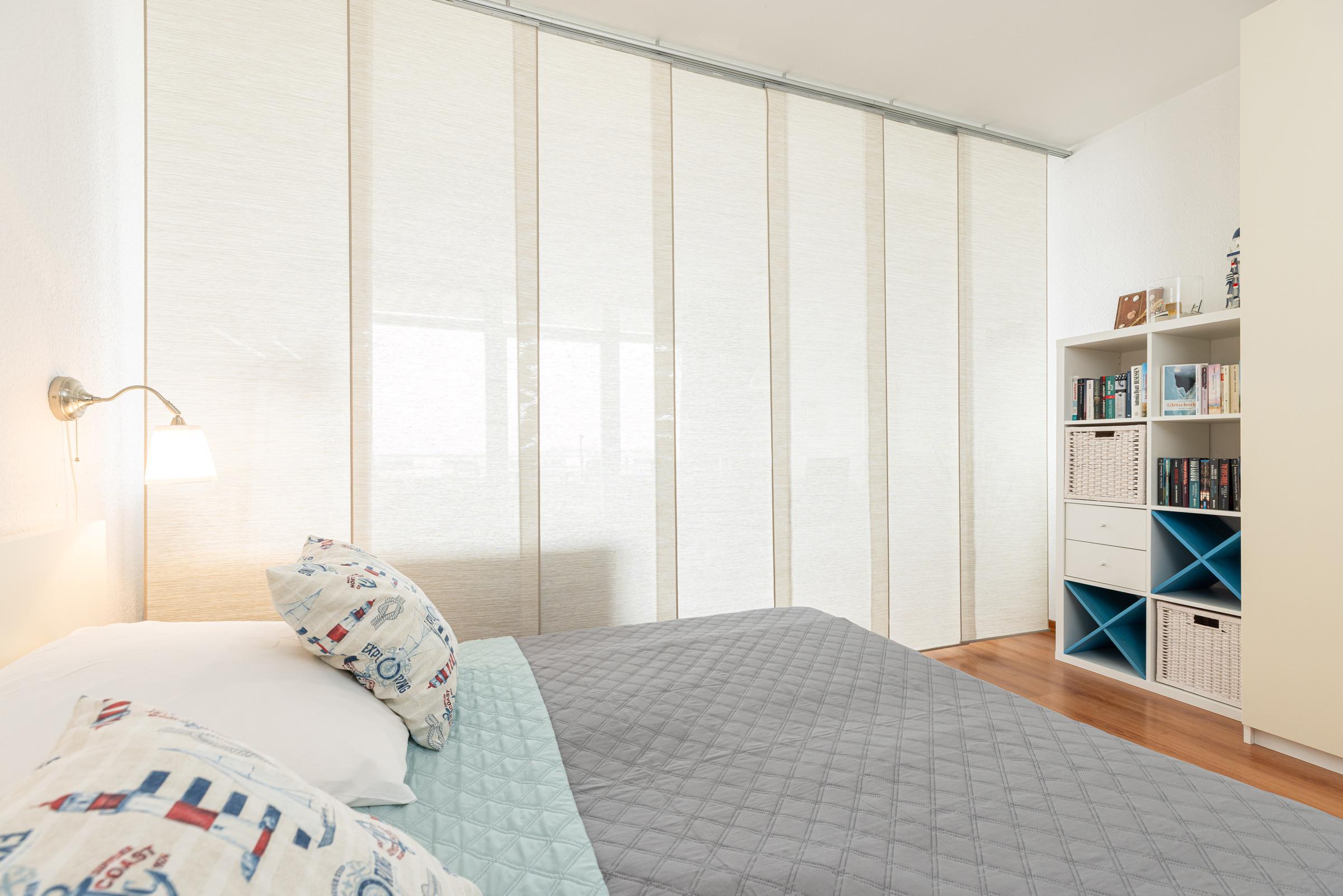 Wohnzimmer: 1 Doppelbett, Verdunkelung: Gardinen, Platz für ein Babybett vorhanden