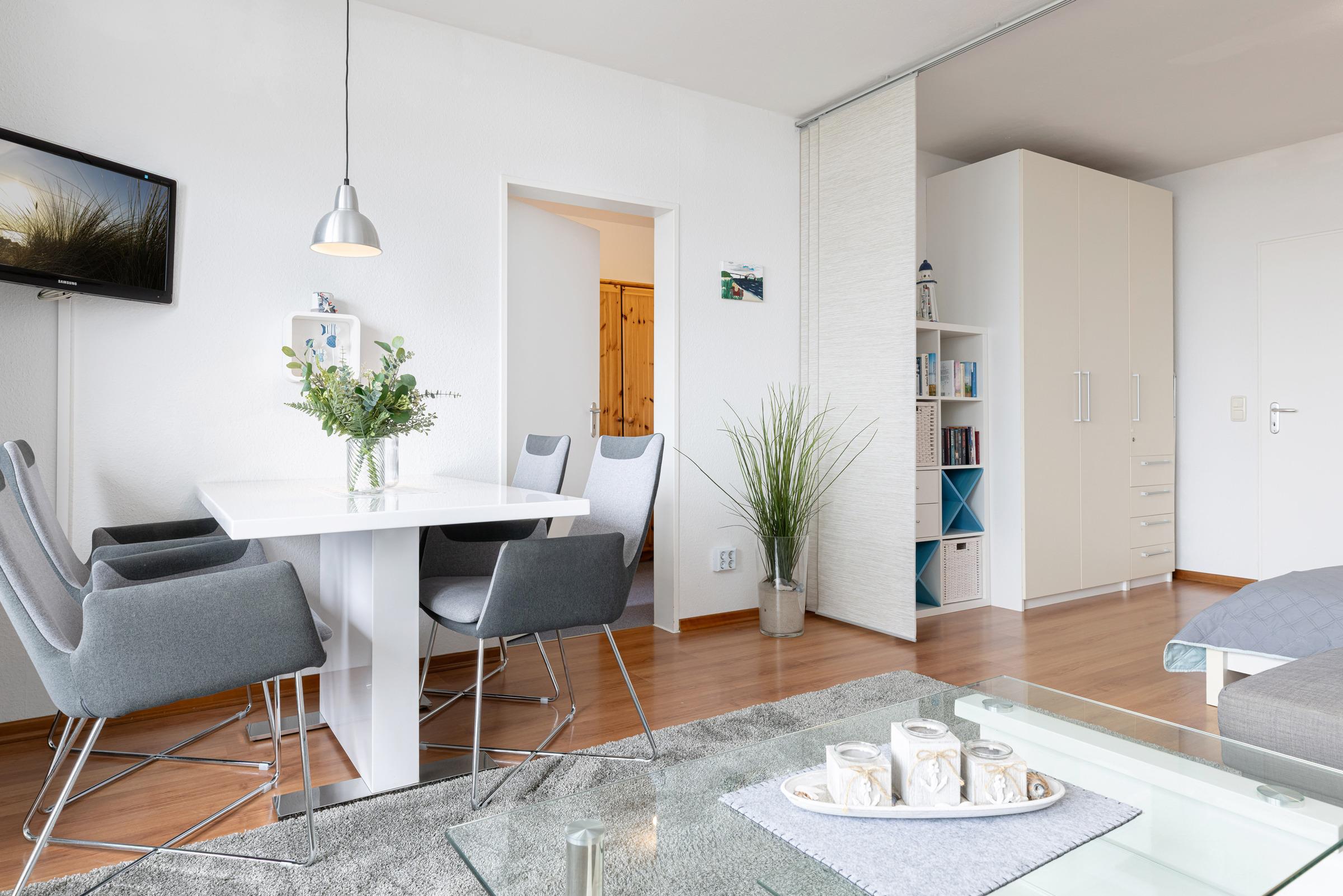 Die 49 m² große 2-Zimmer-Ferienwohnung Fernblick für bis zu 3 Personen liegt direkt am Südstrand, dem schönsten Sandstrand der Insel Fehmarn. Die Wohnung befindet sich in der 3. Etage eines vierstöckigen Appartementhauses und bietet einen seitlichen Meerblick.