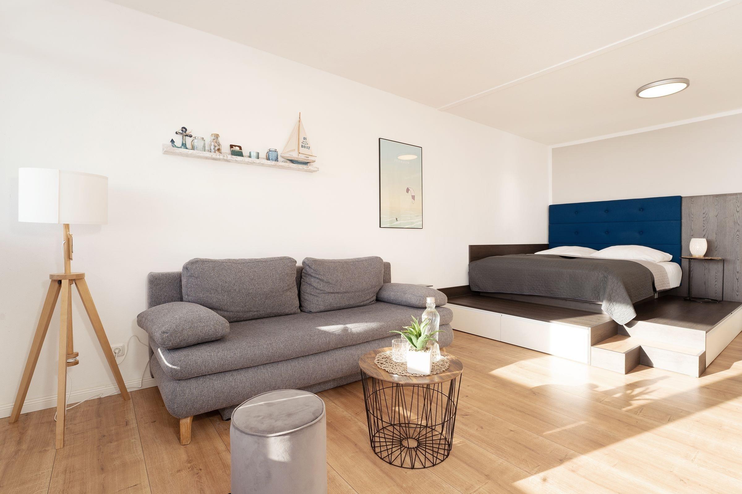 Die zauberhafte Wohnung bietet Ihnen ein gemütliches Wohnschlafzimmer mit komfortablen Doppelbett und einer gemütlichen Schlafcouch. Hier können Sie sich nach einem ereignisreichen Tag perfekt erholen. Ein Highlight ist der schöne möblierte Balkon, von dem aus Sie das Meer überblicken können. Genießen Sie die gesunde Meeresbrise und tauchen Sie in die pure Entspannung ab. Die gut ausgestattete Küche bietet Ihnen alles, was Sie für die Zubereitung Ihrer Lieblingsspeisen benötigen. Ein kleines aber feines Bad rundet die Wohnung ab. Nur wenige Schritte von der Ferienwohnung entfernt befindet sich der Yachthafen, von dem aus Sie zahlreiche Cafés, Restaurants, Bars und Spielplätze entlang der Strandpromenade erreichen können. Genießen Sie kulinarische Köstlichkeiten und lassen Sie sich von der lebendigen Atmosphäre des Ortes verzaubern.