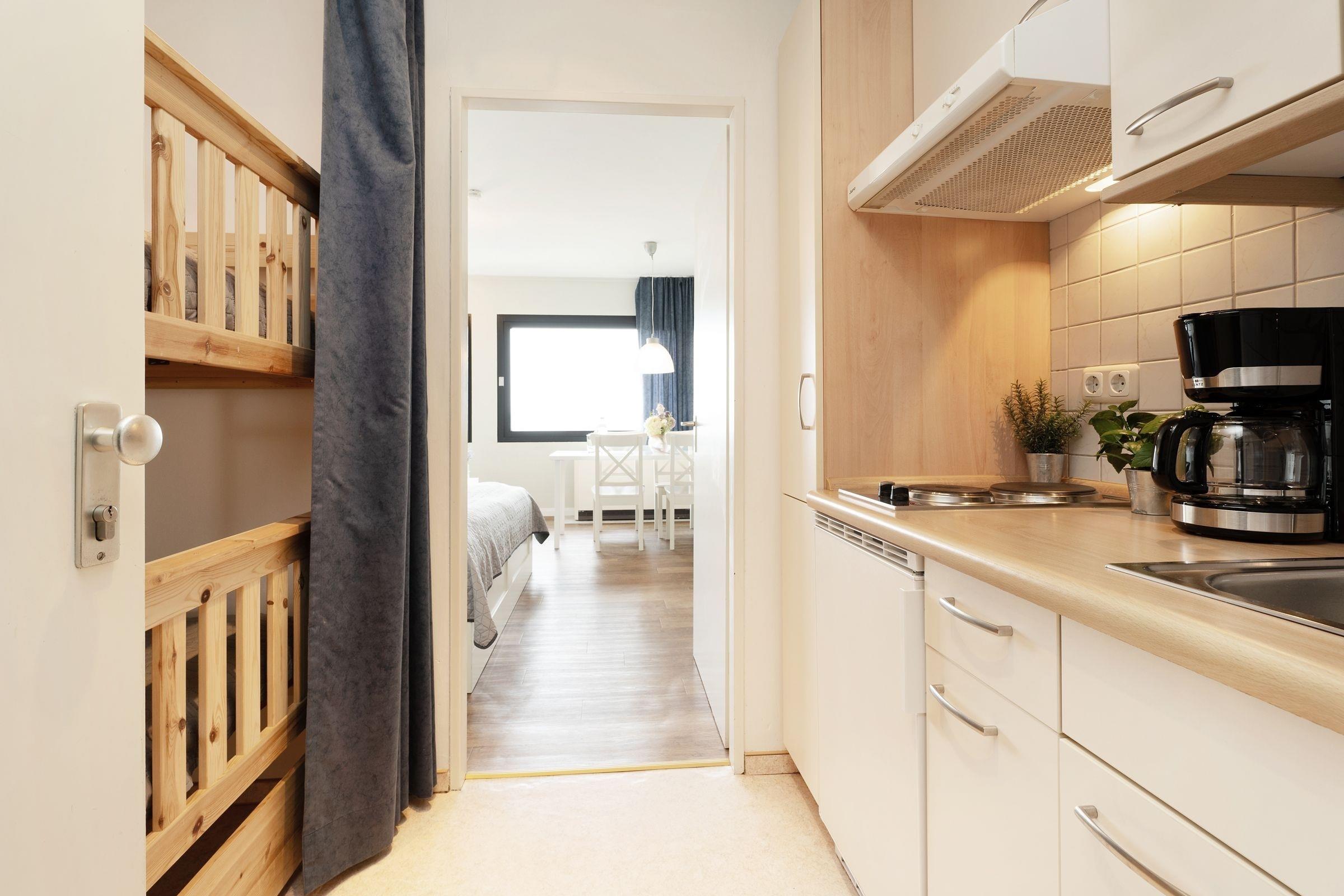 Herzlich Willkommen im Appartement Heimathafen! Hier können Sie wunderbar die Seele baumeln lassen. Die Ferienwohnung besticht durch ihre wunderbare Lage - umgeben von Wasser. Im hellen Wohn-/Schlafbereich befindet sich ein gemütliches kleines Sofa, ein schöner Esstisch sowie ein bequemes Doppelbett (180x200 cm) zum Träumen. Durch die großen Fenster haben Sie praktisch von überall aus einen tollen Meerblick. Öffnen Sie die Fenster, um dazu noch die frische Meeresluft zu atmen und um den Möwen zu lauschen. In der kleinen, offenen Kochnische mit Herd, Kühlschrank, Kaffeemaschine und Wasserkocher können Sie sich gut selbst verpflegen. Für Kinder steht separat, zwischen dem Küchenbereich und dem innenliegen Badezimmer mit Badewanne mit Duschfunktion, ein Etagenbett zur Verfügung. Fußläufig befinden sich kleine Läden für die Brötchen am Morgen, ein Waschsalon und Lokale, um bei Tee und Kuchen den Tag zu genießen, den Sonnenuntergang an der Uferpromenade und die letzten Kiter zu beobachten.