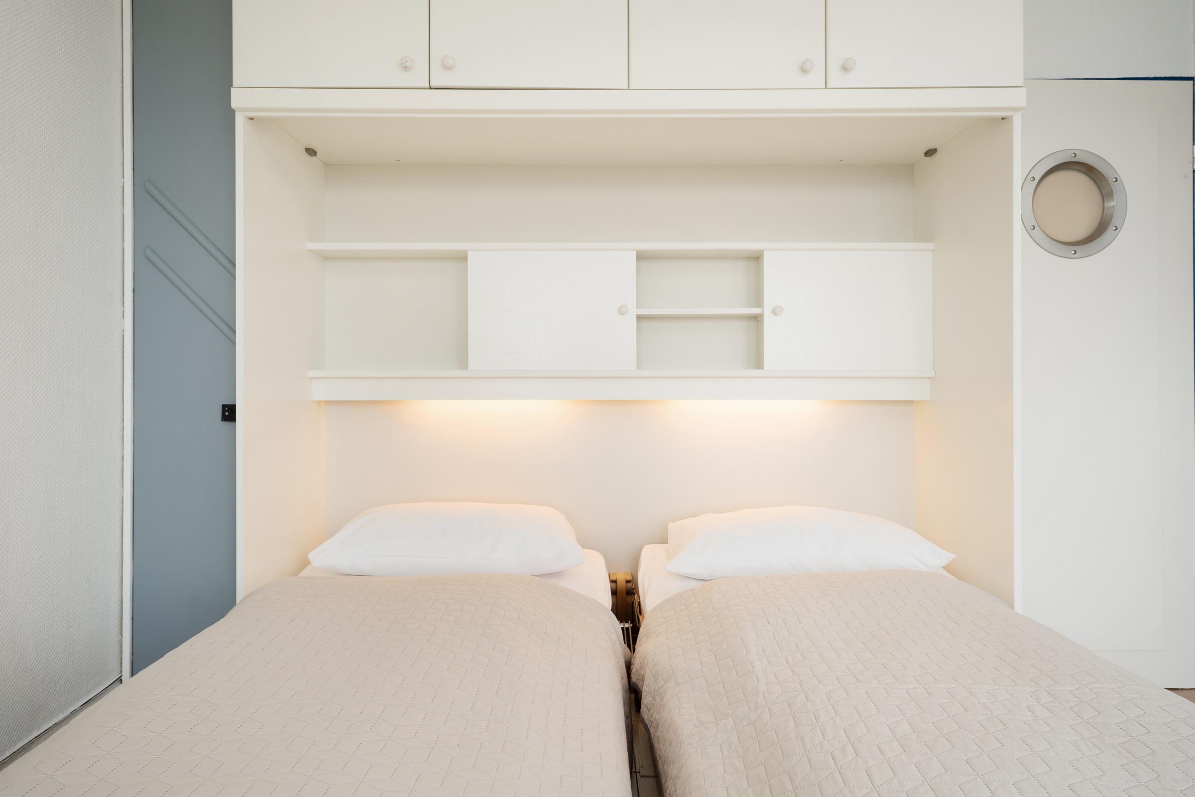Wohn-/ Schlafzimmer: 1 Schrankbett (2 x 80 x 190 cm) und Schlafsofa (130 x 200 cm), Kleiderschrank, Verdunkelung: Rollos und Übergardinen, Platz für ein Babybett vorhanden