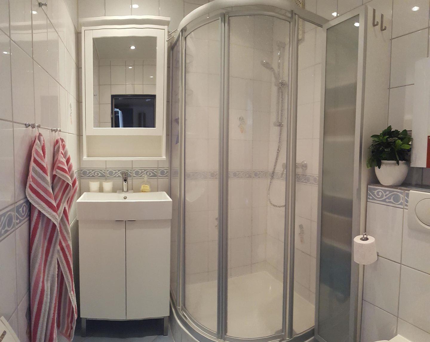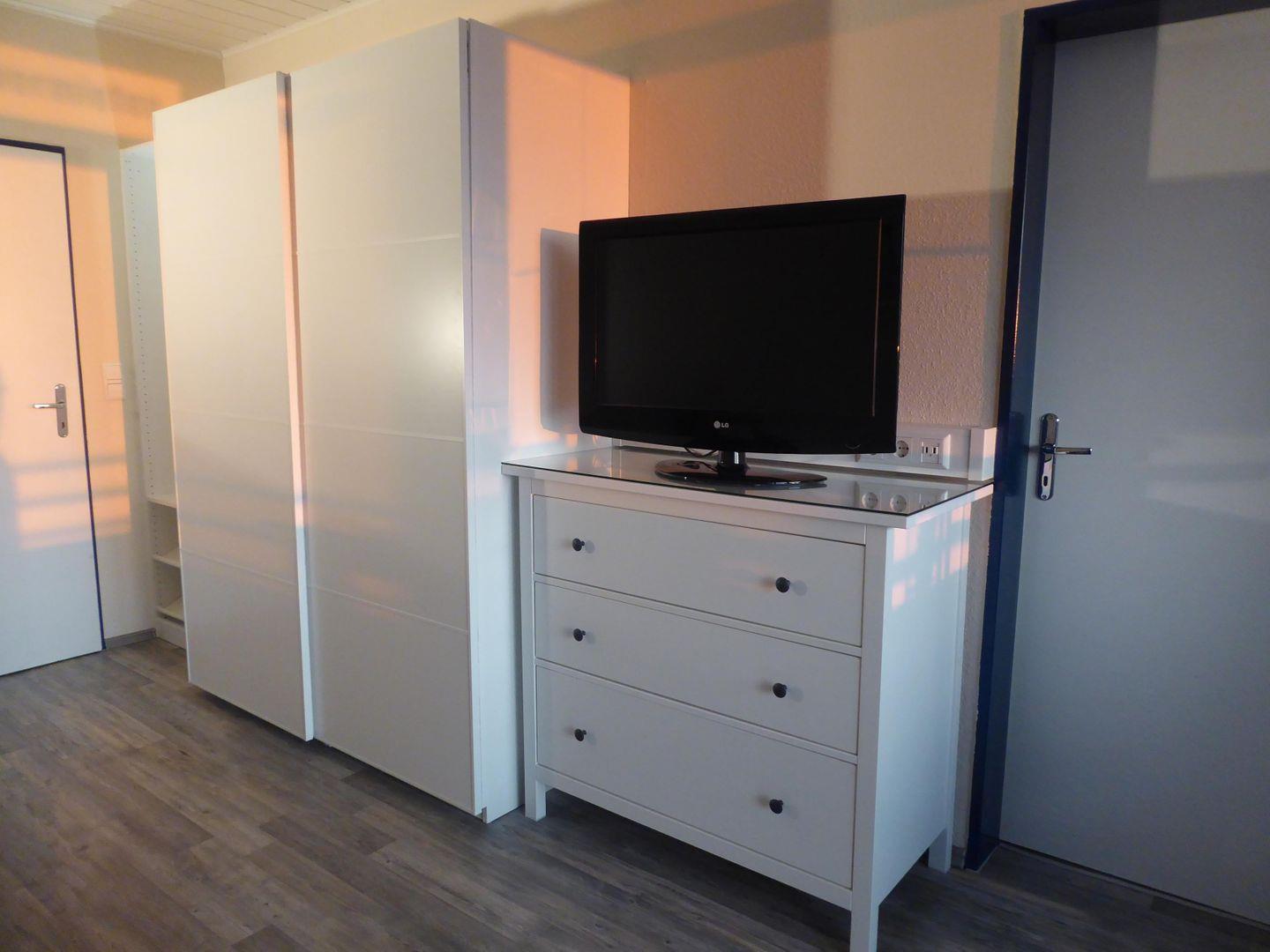 Vom Balkon aus hat man einen wunderbaren Meerblick. Die Ferienwohnung verfügt über einen kombinierten Wohn-/Schlafraum mit Essecke, Flachbild-TV und CD-Radio, einen separaten Schlafraum mit einem Etagenbett und einem zusätzlichen Kinderreisebett sowie ein Kinderhochstuhl, einem Bad mit Dusche und WC und einer komplett ausgestatteten Küche mit Geschirrspüler, Mikrowelle, Kühl- und Gefrierschrank und Herd mit Backofen.