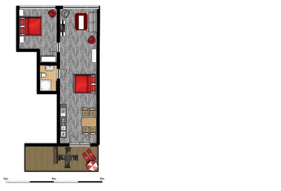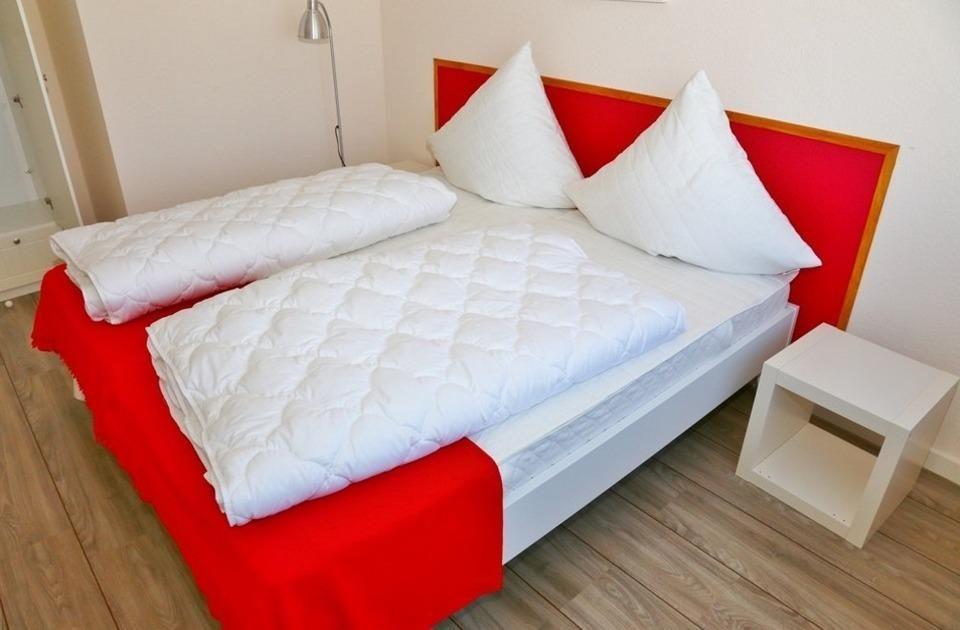 Die Wohnung 10 ist die Eckwohnung im 1. Obergeschoss und somit ideal für Gäste, die es etwas ruhiger mögen. Sie ist über die Terrasse zu erreichen. Im Objekt befindet sich ein festes w-lan Netzwerk, in der Wohnung ein smart TV. Die Wohnung besteht aus einem großen Wohn-/Schlafraum mit Schlafsofa (140x200cm) sowie einem Wandklappbett (180x200cm) und einem Essplatz für bis zu 6 Personen. Die im selben Raum befindliche Versorgungsbar ist mit einem Kühlschrank, einer Mikrowelle und einem Kochfeld sowie einem mobilen Minibackofen ausgestattet. Geschirr und alles was Sie für Ihren Urlaub benötigen ist ebenfalls vorhanden. Separat steht Ihnen noch ein Schlafzimmer mit Doppelbett (180x200cm) sowie einen Kleiderschrank zur Verfügung. Das Duschbad rundet die Wohnung mit ihren 53qm ab.