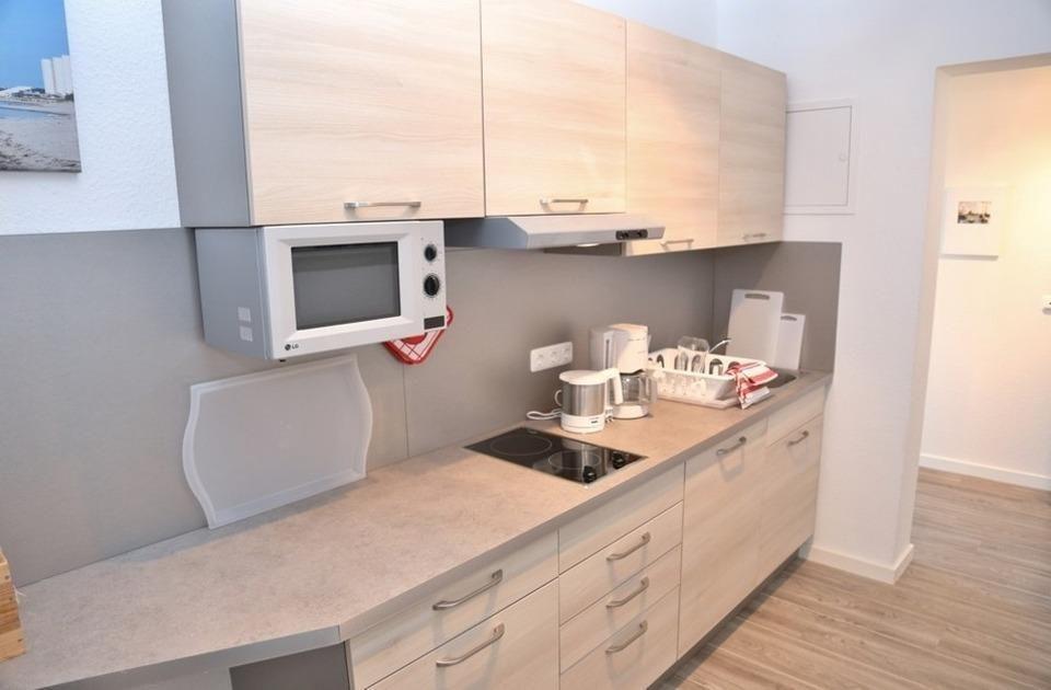 Diese Wohnung ist die größte Wohnung im Erdgeschoss und besteht aus einem Wohnzimmer, einem großen Duschbad, einem separatem Schlafzimmer, einer abgetrennten Versorgungsbar und einem abgetrennten zweiten Schlafbereich. Das Wohn-/Schlafzimmer verfügt über einen TV, BluRay-Player, Radio, einem Sofa welches ausziehbar auf eine 140x200cm Liegefläche ist.Im Objekt befindet sich ein festes w-lan Netzwerk, in der Wohnung ein smart TV. Ein Essbereich mit Tisch und Stühlen ist ebenfalls im Wohnbereich vorhanden. Das separate Schlafzimmer hat den Ausblick zum Yachthafen und verfügt über einen großen Kleiderschrank, einen Sessel und einem Doppelbett (180x200cm). Der separate Schlafbereich verfügt über eine große Kommode und einem Wandklappbett (180x200cm). Das Badezimmer ist sehr geräumig und mit einer barrierefreien ebenerdigen Dusche ausgestattet. Die Versorgungsbar verfügt über einen Kühlschrank, einen Cerankochfeld, einem Waschbecken, Toaster, Kaffeemaschine, Mini-Mobilbackofen und einer Mikrowelle. Die Wohnung ist sowohl über den Hausflur als auch über die Terrassen zugänglich. Ein Strandkorb wartet auf der Terrasse auf Sie.