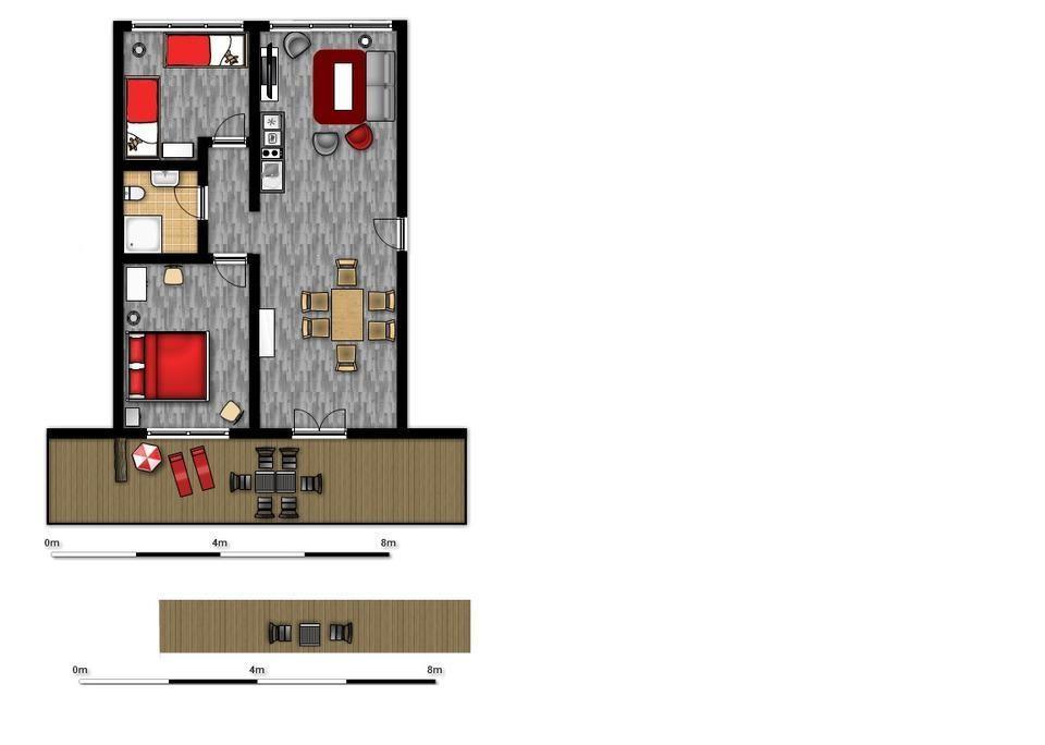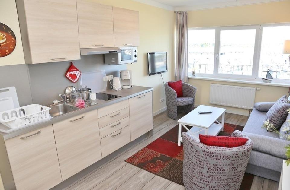 Die Wohnung ist hell und lichtdurchflutet und wie die anderen Wohnung sowohl nach Norden und Süden mit Fenstern verwöhnt. Sie besteht aus zwei separaten Schlafzimmern, einem Wohn-/Schlafraum und einem Badezimmer. Keiner muss durch den Schlafraum des Anderen zur Toiletten, da ein kleiner Flurbereich alle 3 Räume ideal trennt. Das Schlafzimmer nach Süden besteht aus einem Doppelbett, das Schlafzimmer nach Norden aus zwei Einzelbetten, die entweder als Doppelbett zusammengeschoben werden können oder als L-Form mit Abstand für zwei Kinder ideal ist. Die Wohnung ist folglich Top für Familien mit 2 Kindern oder für 2 Pärchen, die sich eine Wohnung teilen möchten. Im Wohn-/Schlafraum lässt sich das Sofa auf 140x200cm ausziehen und bietet für eine weitere Person einen idealen Schlafplatz. Im Objekt befindet sich ein festes w-lan Netzwerk, in der Wohnung ein smart TV. Die Sitzecke ist im Südflügel der Wohnung und bietet für alle ausreichend Platz zum Sitzen. Die Versorgungsbar ist mit Mikrowelle, Cerankochfeld, Kühlschrank und ausreichend Geschirr ausgestattet. Einen Toaster und eine Kaffeemaschine sind selbstverständlich vorhanden. Ein eigener PKW-Stellplatz ist direkt vorm Haus kostenfrei und W-LAN in der gesamten Wohnung gut zu empfangen.
