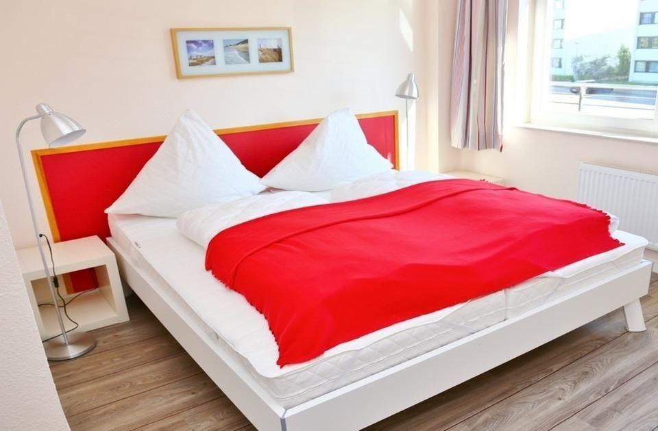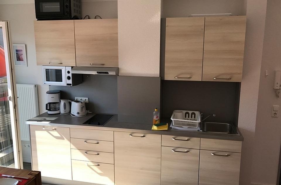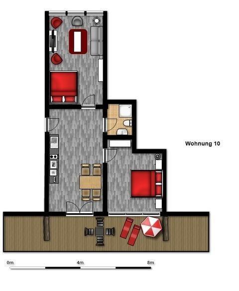 Die Wohnung 10 ist die Eckwohnung im 1. Obergeschoss und somit ideal für Gäste, die es etwas ruhiger mögen. Sie ist über die Terrasse zu erreichen. Im Objekt befindet sich ein festes w-lan Netzwerk, in der Wohnung ein smart TV. Die Wohnung besteht aus einem großen Wohn-/Schlafraum mit Schlafsofa (140x200cm) sowie einem Wandklappbett (180x200cm) und einem Essplatz für bis zu 6 Personen. Die im selben Raum befindliche Versorgungsbar ist mit einem Kühlschrank, einer Mikrowelle und einem Kochfeld sowie einem mobilen Minibackofen ausgestattet. Geschirr und alles was Sie für Ihren Urlaub benötigen ist ebenfalls vorhanden. Separat steht Ihnen noch ein Schlafzimmer mit Doppelbett (180x200cm) sowie einen Kleiderschrank zur Verfügung. Das Duschbad rundet die Wohnung mit ihren 53qm ab.