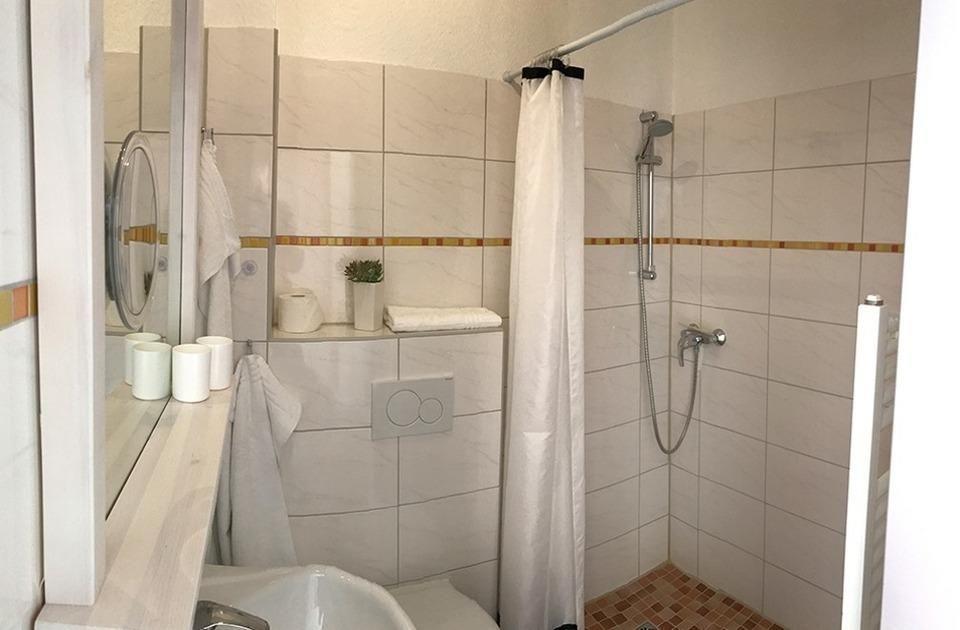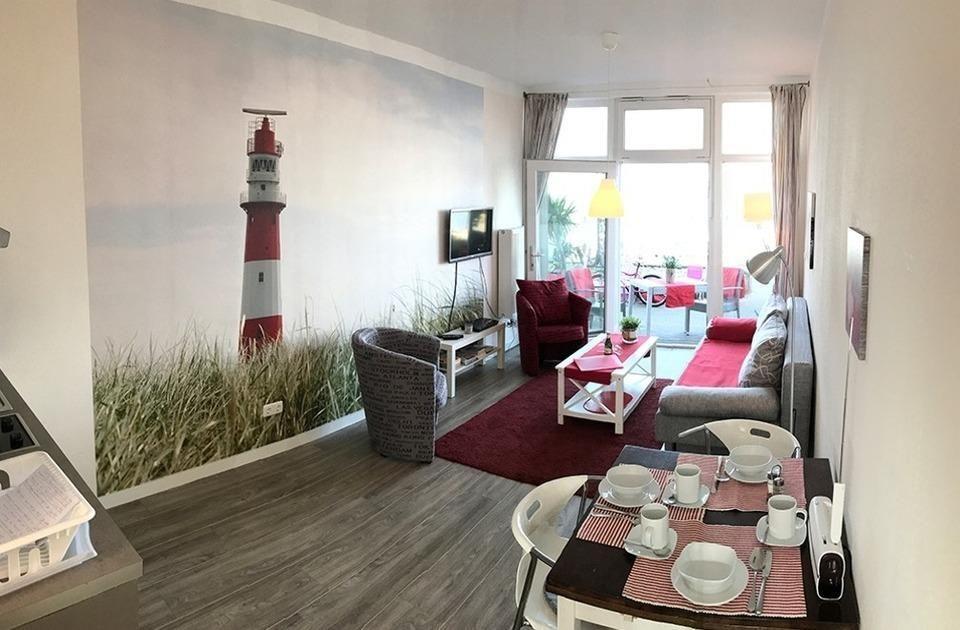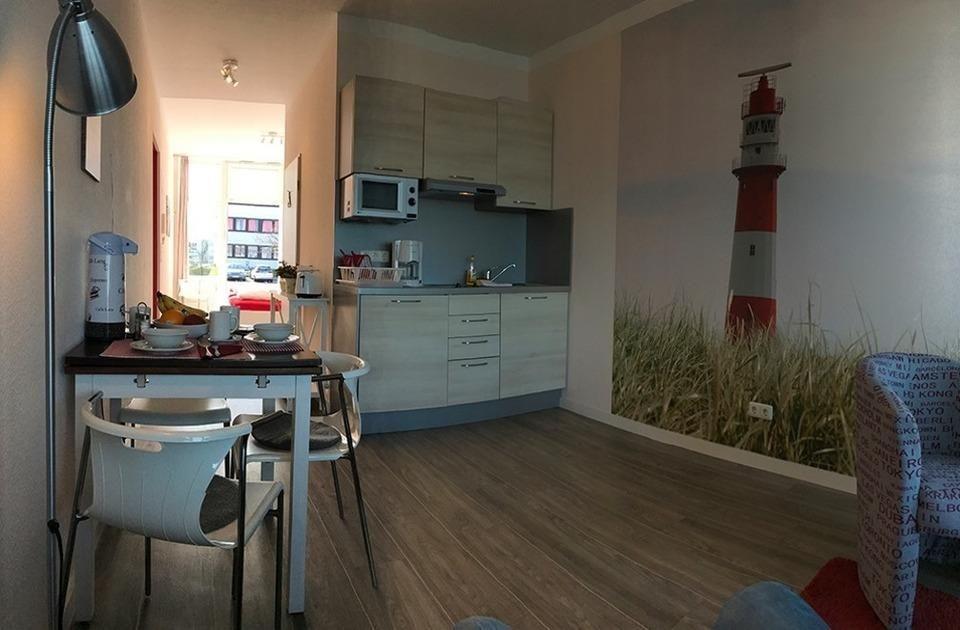 Sie besteht aus einem Wohnzimmer mit Essecke mit 4 Sitzplätzen, einer Versorgungsbar mit Kühlschrank, 2 Platten-Ceran-Feld, Mikrowelle, Kaffeemaschine, Toaster und einem Schlafzimmerbereich mit Doppelbett. Das Besondere ist der einmalige Blick auf die neu gestaltete Hafenpromenade mit eigener, abgetrennter Holzterrasse. Das Sofa im Wohnzimmer ist ausziehbar und verfügt über 1 weitere Schlafmöglichkeit (140 x 200cm). Vom Sofa schaut man auf den tollen Leuchtturm an der Zimmerwand und auf die Schiffe im Hafen mit all seinem maritimen Flair. Im Objekt befindet sich ein festes w-lan Netzwerk, in der Wohnung ein smart TV. Das Badezimmer besticht durch seine ebenerdige Dusche und ist somit auch für gehbehinderte Menschen ideal. Der kostenfreie, neugestaltete PKW-Stellplatz ist direkt vor der Tür.