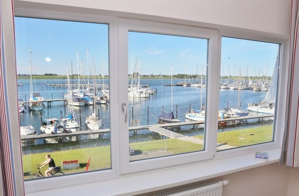 Genießen Sie maritimes Flair in einem Apartment mit Balkon und Blick auf den Yachthafen in Fehmarn, inklusive privatem Parkplatz.