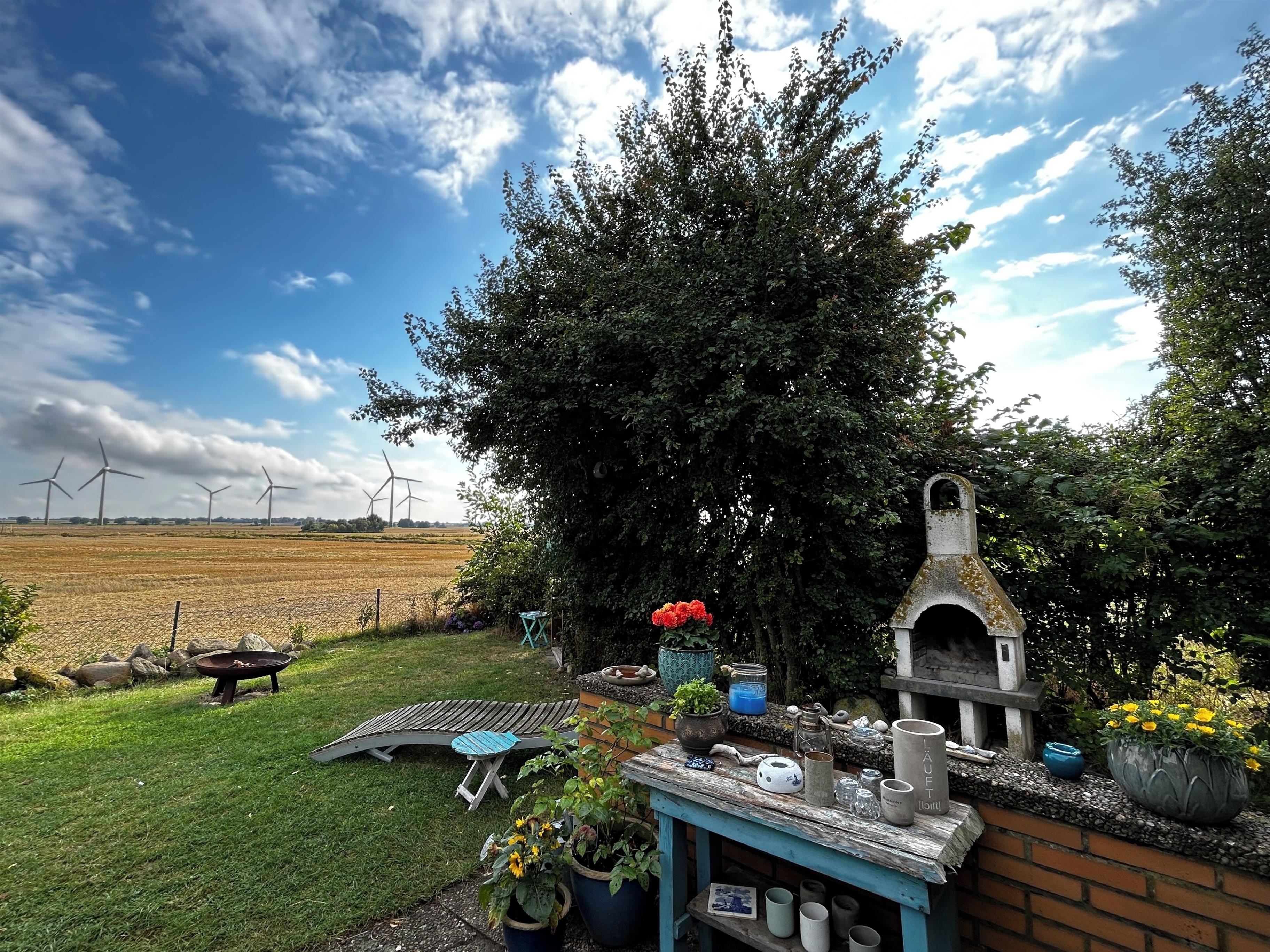 mit gemütlicher Terrasse, etwas Ostseeblick, kleinem Garten, Sauna und einem Kaminofen im Wohnzimmer. Vom Garten aus haben Sie einen herrlichen Blick über die Felder bis hin zur Fehmarnsundbrücke am Horizont.Bis zum Strand sind es nur ein paar Schritte (300 m).
